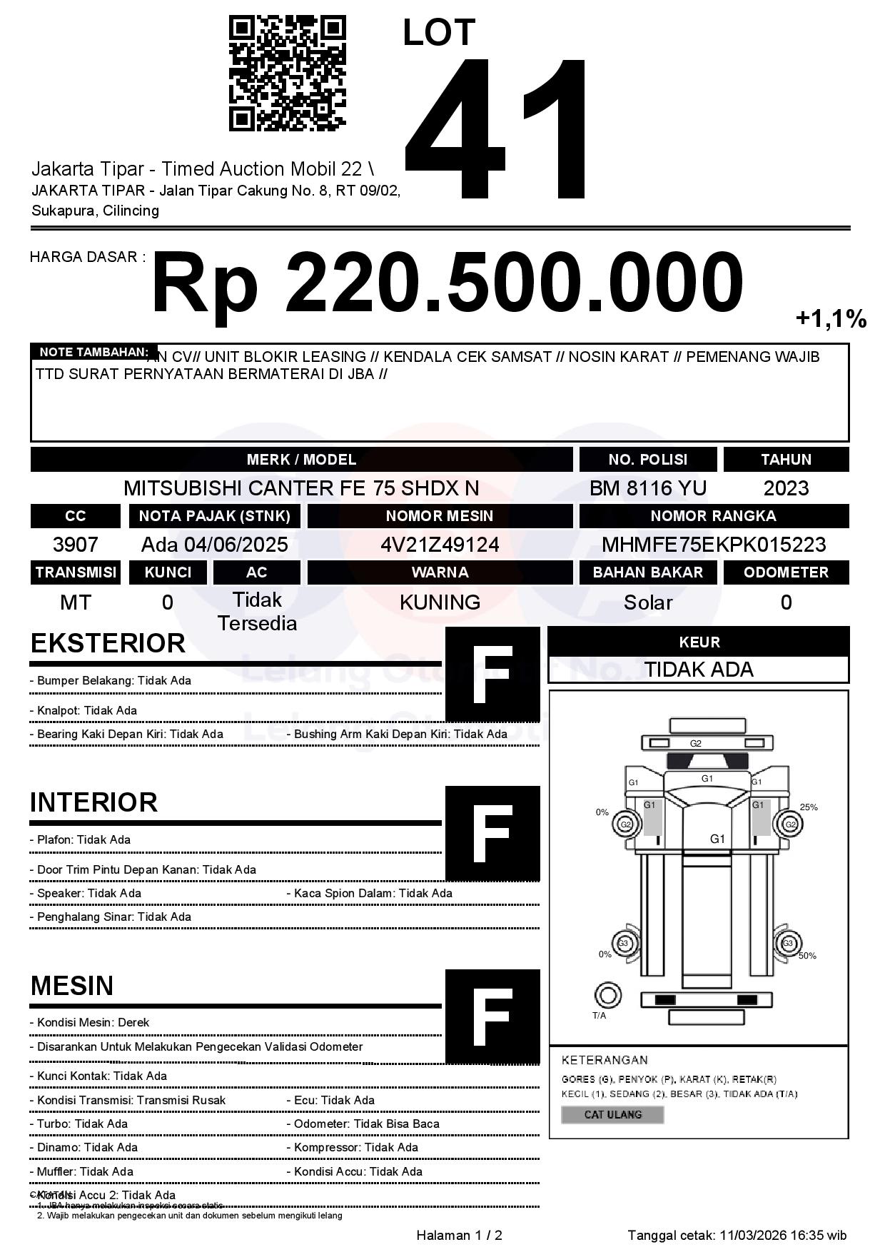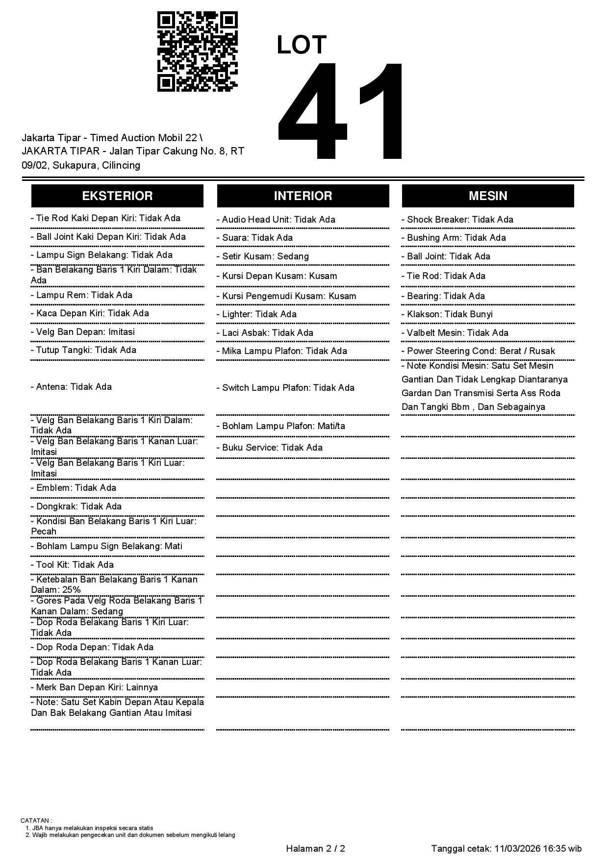 - Kondisi objek lelang dilelang apa adanya, baik kondisi fisik, mesin maupun legalitas kendaraan. Jika terdapat kekurangan/cacat baik yang terlihat maupun yang tidak terlihat, maka semua akan menjadi tanggung jawab/risiko Pemenang Lelang. Oleh karena itu, Pemenang Lelang melepaskan segala hak untuk menuntut dan/atau meminta ganti rugi atas hal tersebut kepada JBA.
