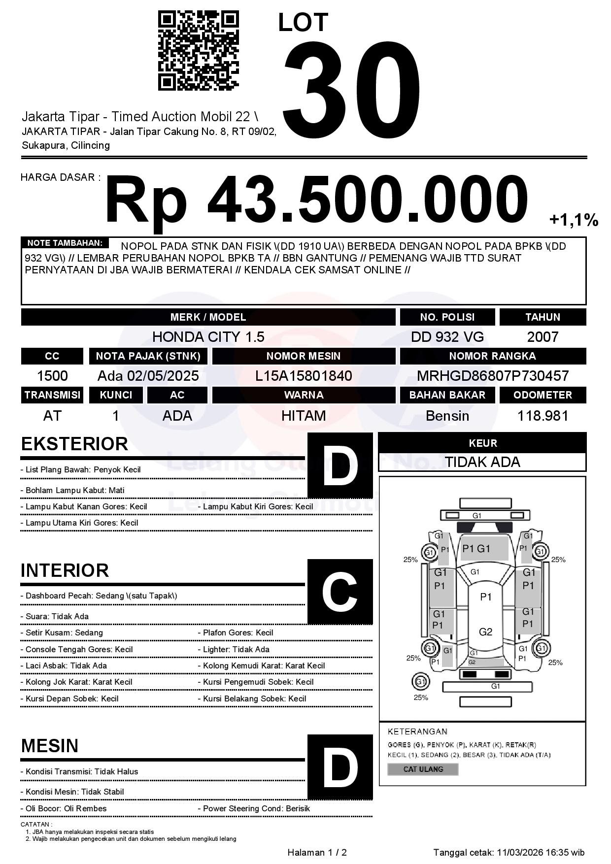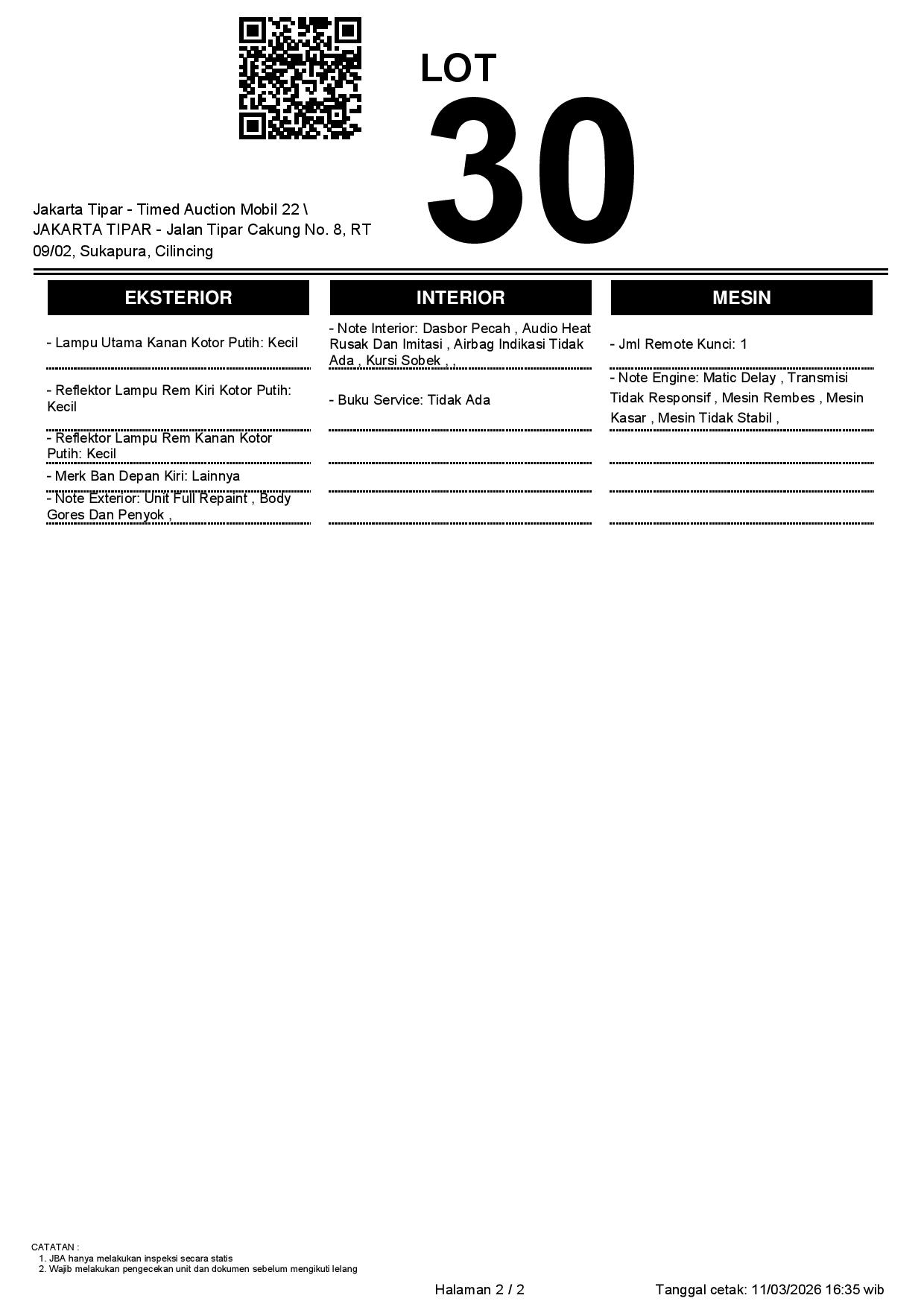 - Kondisi objek lelang dilelang apa adanya, baik kondisi fisik, mesin maupun legalitas kendaraan. Jika terdapat kekurangan/cacat baik yang terlihat maupun yang tidak terlihat, maka semua akan menjadi tanggung jawab/risiko Pemenang Lelang. Oleh karena itu, Pemenang Lelang melepaskan segala hak untuk menuntut dan/atau meminta ganti rugi atas hal tersebut kepada JBA.