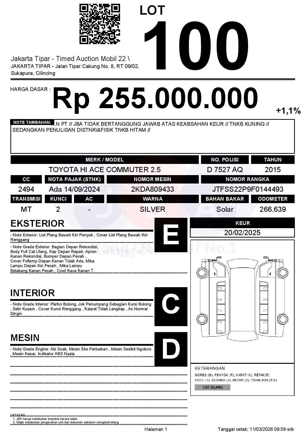 - Kondisi objek lelang dilelang apa adanya, baik kondisi fisik, mesin maupun legalitas kendaraan. Jika terdapat kekurangan/cacat baik yang terlihat maupun yang tidak terlihat, maka semua akan menjadi tanggung jawab/risiko Pemenang Lelang. Oleh karena itu, Pemenang Lelang melepaskan segala hak untuk menuntut dan/atau meminta ganti rugi atas hal tersebut kepada JBA.