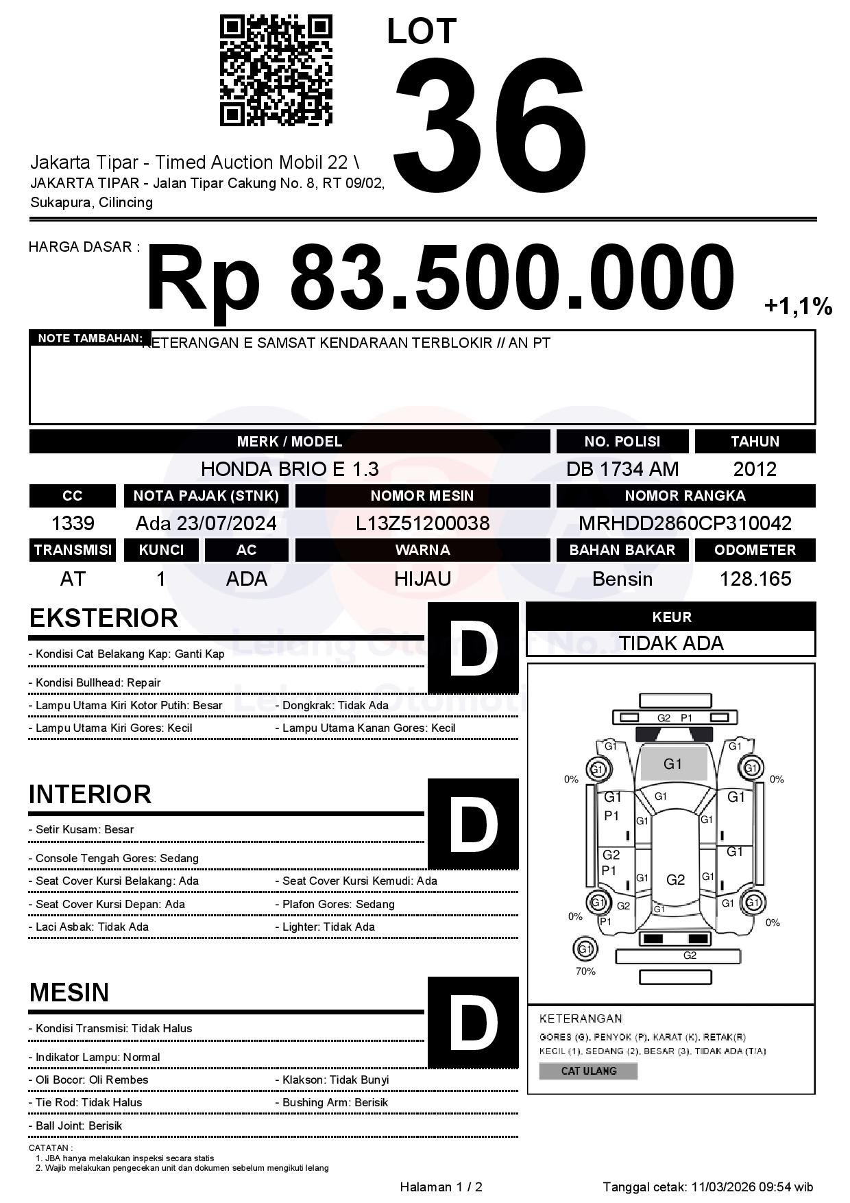 - Kondisi objek lelang dilelang apa adanya, baik kondisi fisik, mesin maupun legalitas kendaraan. Jika terdapat kekurangan/cacat baik yang terlihat maupun yang tidak terlihat, maka semua akan menjadi tanggung jawab/risiko Pemenang Lelang. Oleh karena itu, Pemenang Lelang melepaskan segala hak untuk menuntut dan/atau meminta ganti rugi atas hal tersebut kepada JBA.