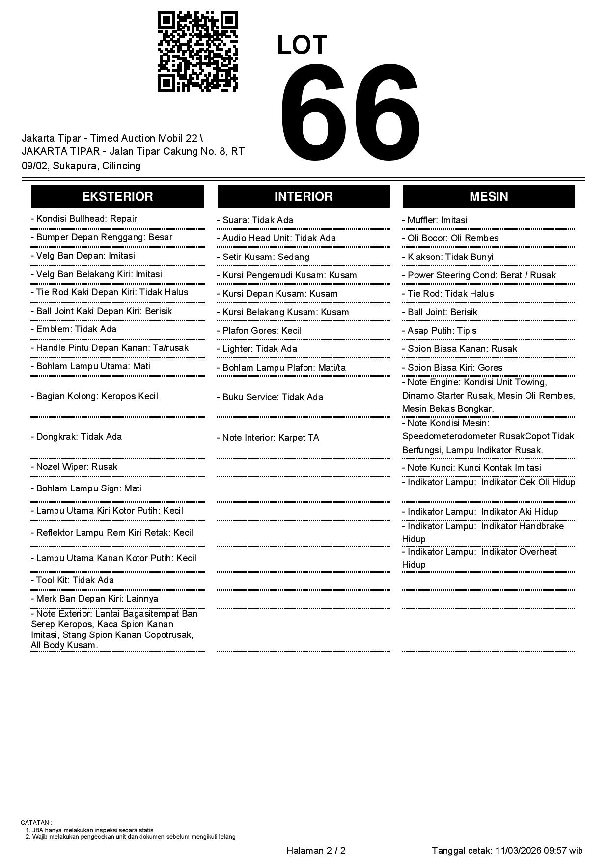 - Kondisi objek lelang dilelang apa adanya, baik kondisi fisik, mesin maupun legalitas kendaraan. Jika terdapat kekurangan/cacat baik yang terlihat maupun yang tidak terlihat, maka semua akan menjadi tanggung jawab/risiko Pemenang Lelang. Oleh karena itu, Pemenang Lelang melepaskan segala hak untuk menuntut dan/atau meminta ganti rugi atas hal tersebut kepada JBA.