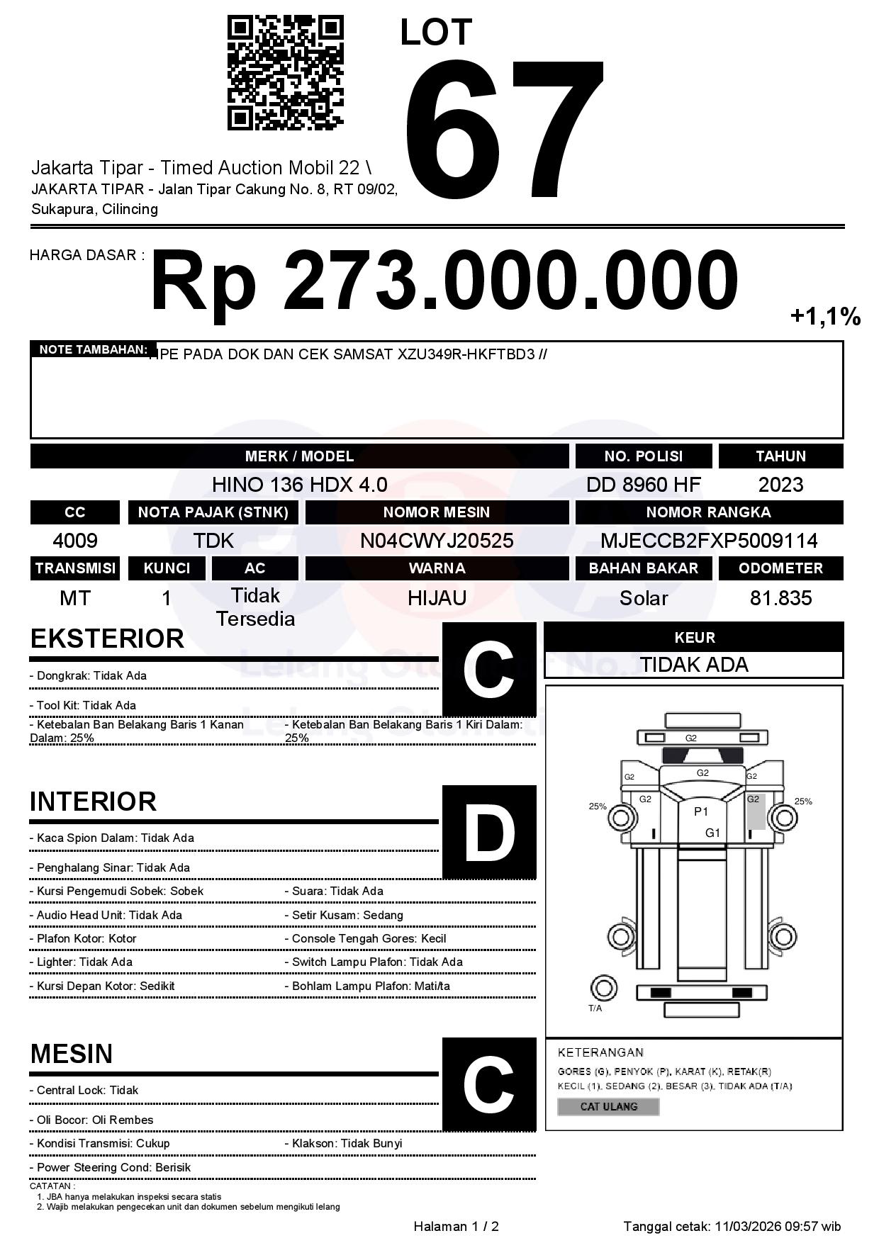 - Kondisi objek lelang dilelang apa adanya, baik kondisi fisik, mesin maupun legalitas kendaraan. Jika terdapat kekurangan/cacat baik yang terlihat maupun yang tidak terlihat, maka semua akan menjadi tanggung jawab/risiko Pemenang Lelang. Oleh karena itu, Pemenang Lelang melepaskan segala hak untuk menuntut dan/atau meminta ganti rugi atas hal tersebut kepada JBA.