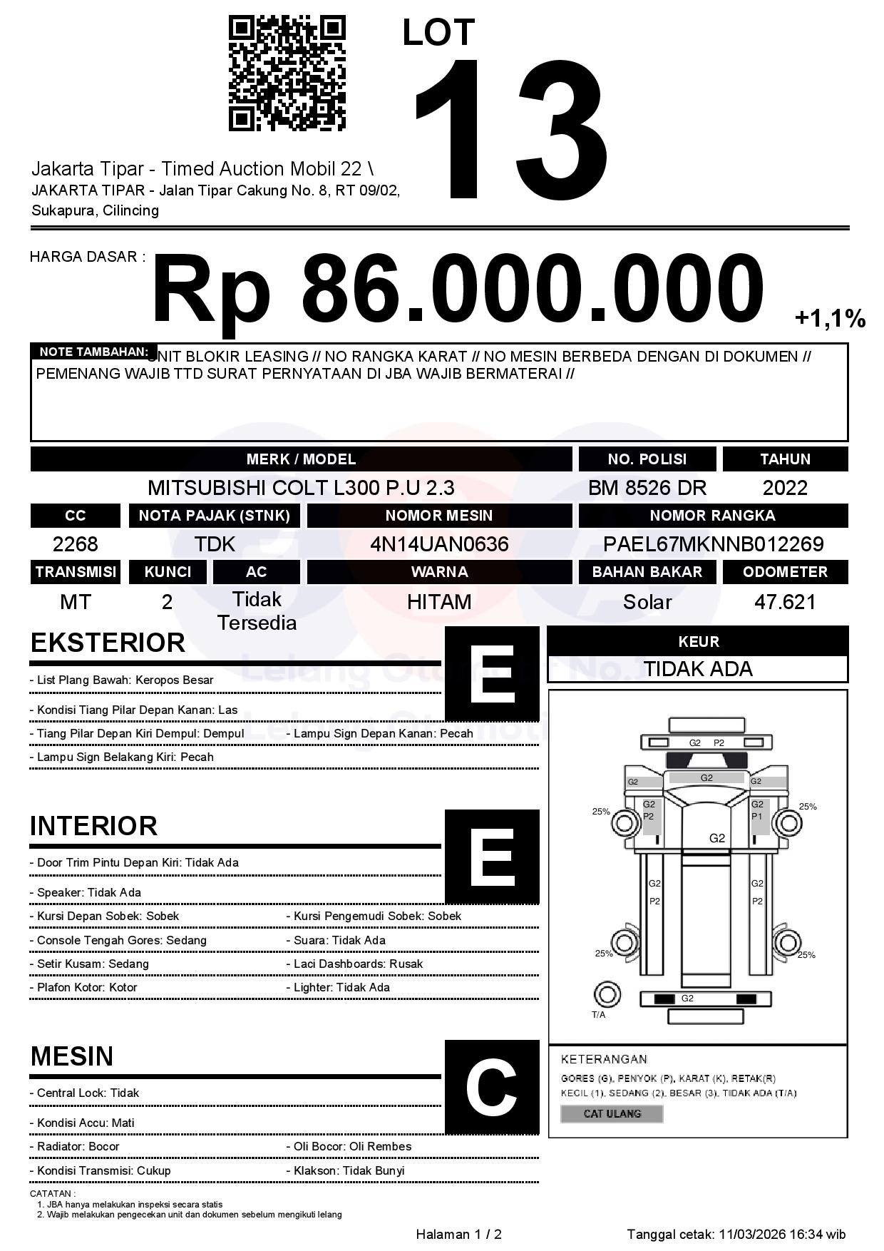 - Kondisi objek lelang dilelang apa adanya, baik kondisi fisik, mesin maupun legalitas kendaraan. Jika terdapat kekurangan/cacat baik yang terlihat maupun yang tidak terlihat, maka semua akan menjadi tanggung jawab/risiko Pemenang Lelang. Oleh karena itu, Pemenang Lelang melepaskan segala hak untuk menuntut dan/atau meminta ganti rugi atas hal tersebut kepada JBA.