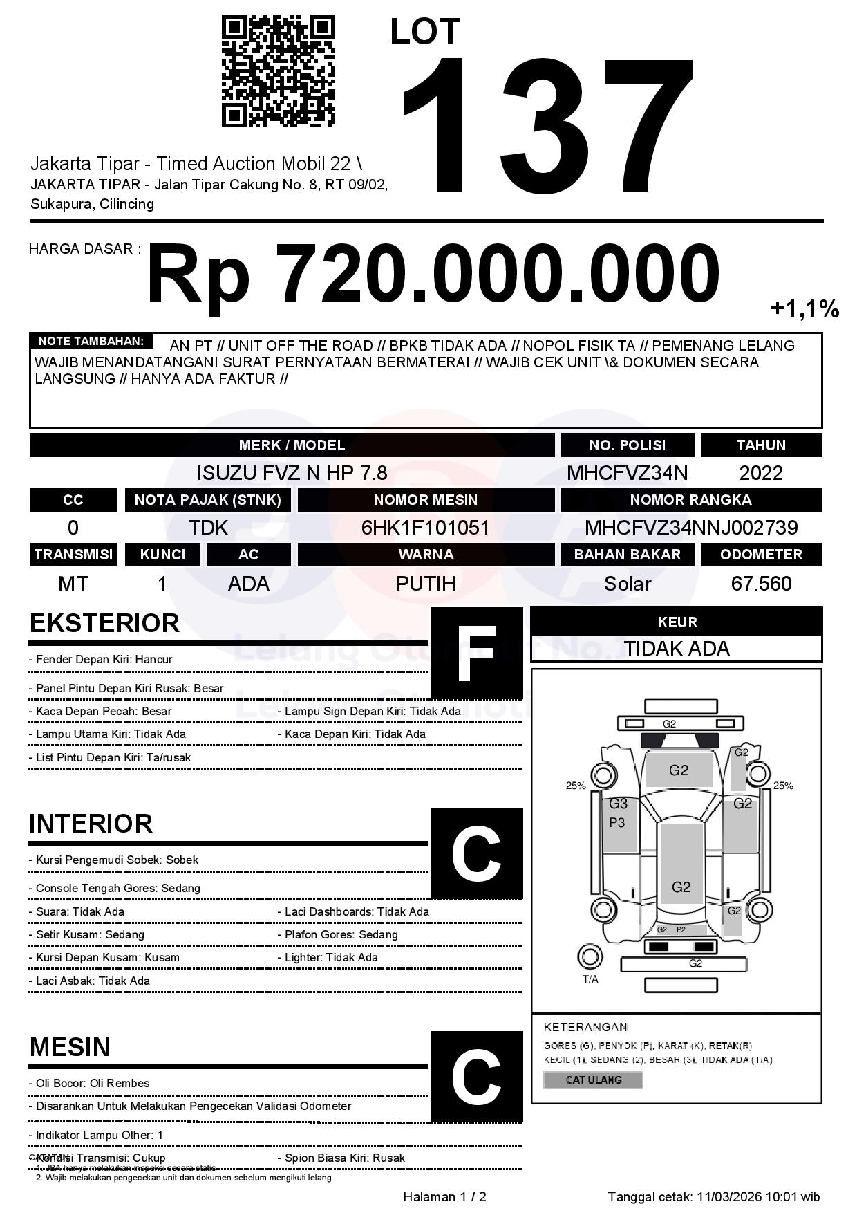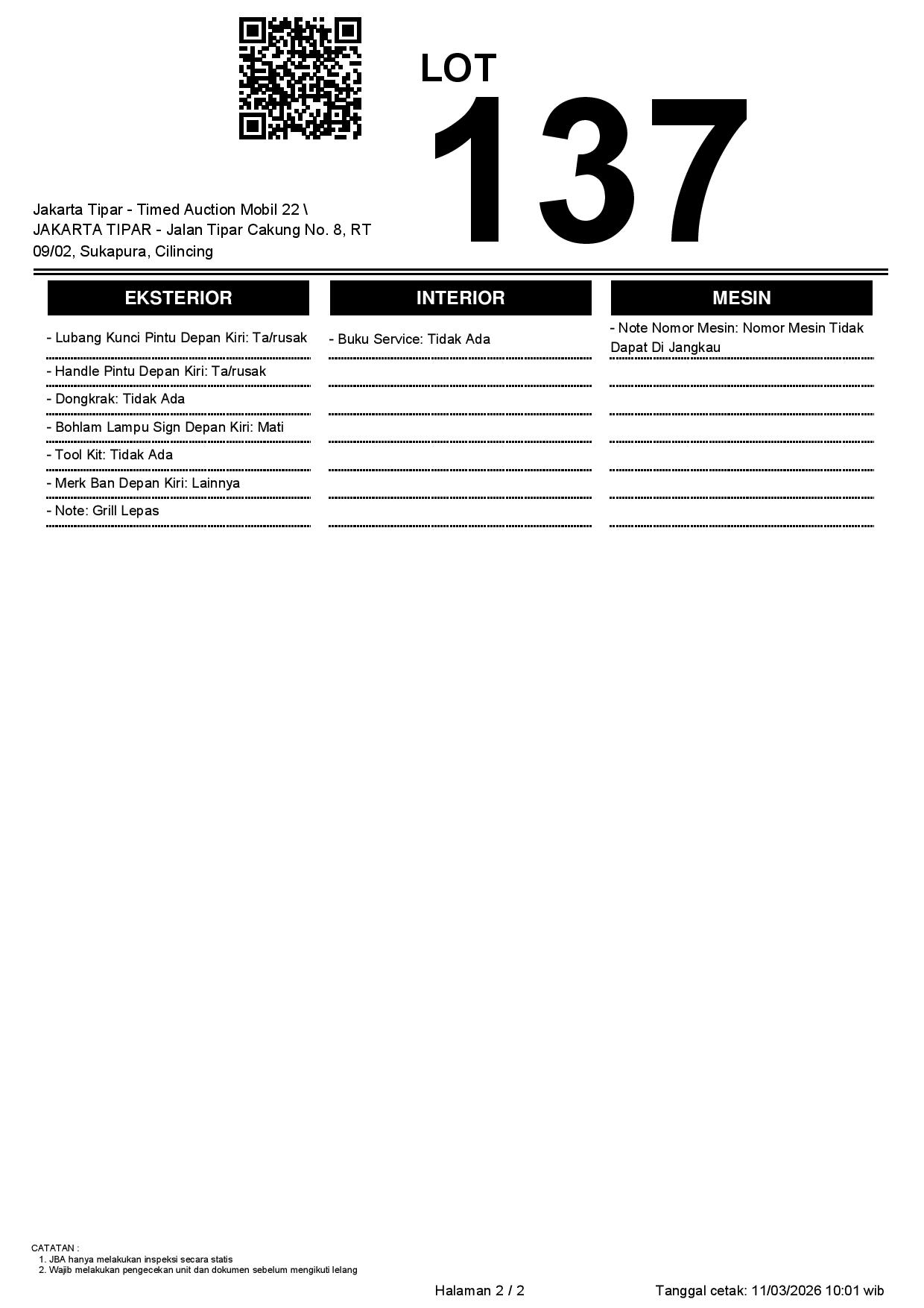 - Kondisi objek lelang dilelang apa adanya, baik kondisi fisik, mesin maupun legalitas kendaraan. Jika terdapat kekurangan/cacat baik yang terlihat maupun yang tidak terlihat, maka semua akan menjadi tanggung jawab/risiko Pemenang Lelang. Oleh karena itu, Pemenang Lelang melepaskan segala hak untuk menuntut dan/atau meminta ganti rugi atas hal tersebut kepada JBA.