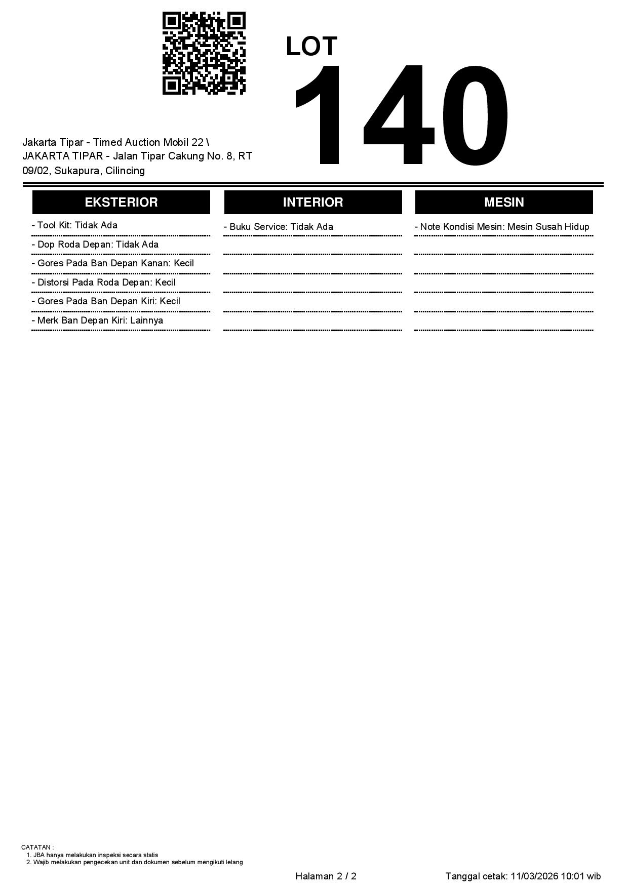 - Kondisi objek lelang dilelang apa adanya, baik kondisi fisik, mesin maupun legalitas kendaraan. Jika terdapat kekurangan/cacat baik yang terlihat maupun yang tidak terlihat, maka semua akan menjadi tanggung jawab/risiko Pemenang Lelang. Oleh karena itu, Pemenang Lelang melepaskan segala hak untuk menuntut dan/atau meminta ganti rugi atas hal tersebut kepada JBA.
