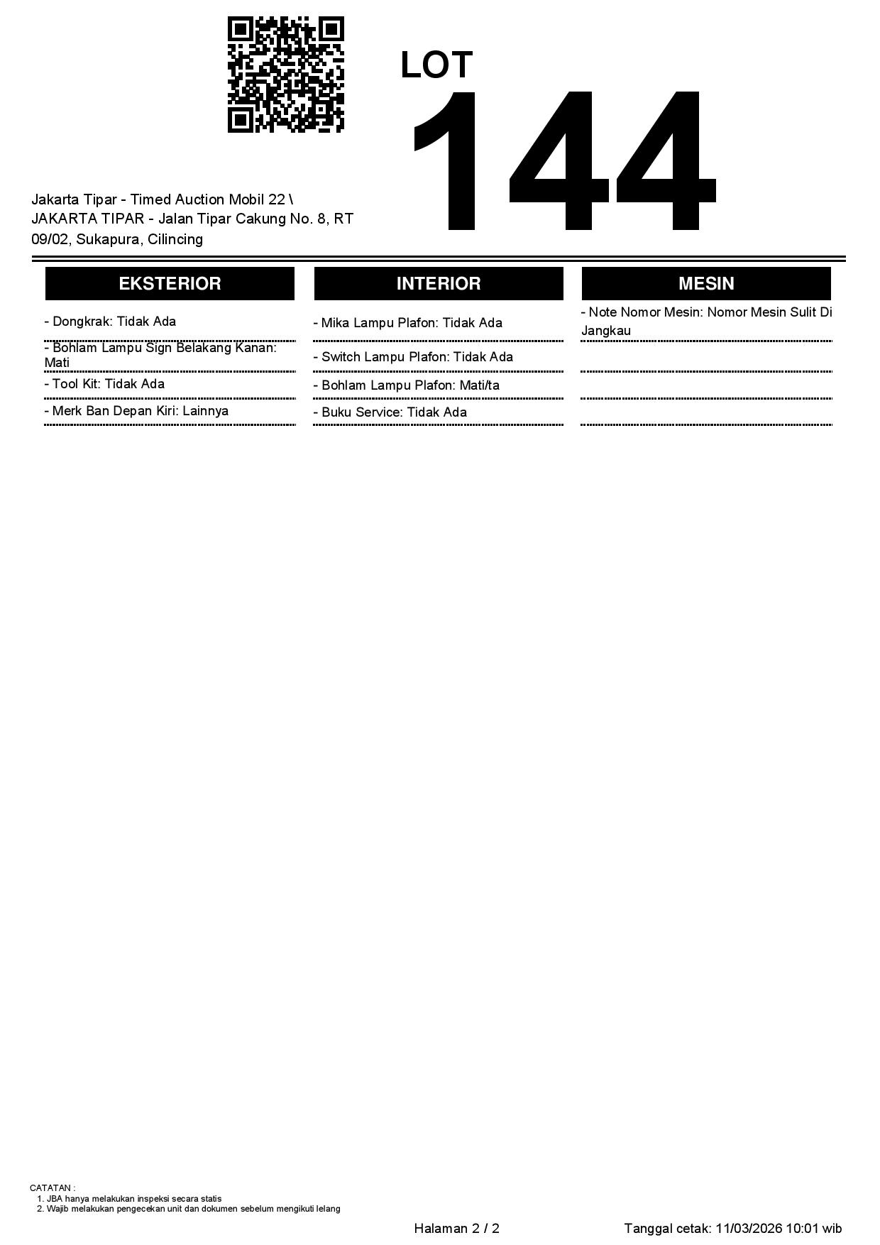 - Kondisi objek lelang dilelang apa adanya, baik kondisi fisik, mesin maupun legalitas kendaraan. Jika terdapat kekurangan/cacat baik yang terlihat maupun yang tidak terlihat, maka semua akan menjadi tanggung jawab/risiko Pemenang Lelang. Oleh karena itu, Pemenang Lelang melepaskan segala hak untuk menuntut dan/atau meminta ganti rugi atas hal tersebut kepada JBA.