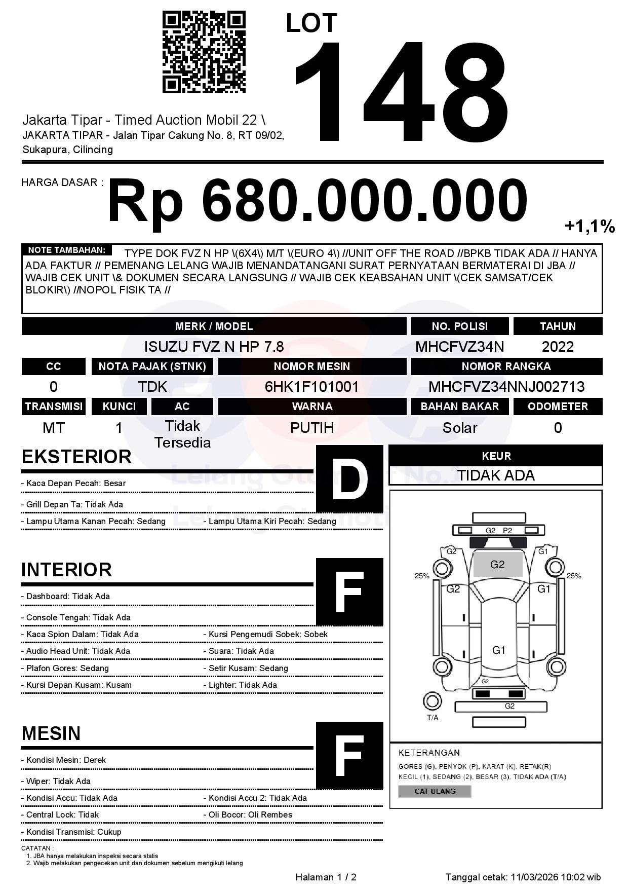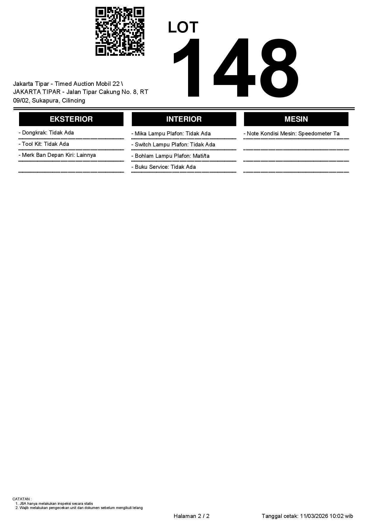 - Kondisi objek lelang dilelang apa adanya, baik kondisi fisik, mesin maupun legalitas kendaraan. Jika terdapat kekurangan/cacat baik yang terlihat maupun yang tidak terlihat, maka semua akan menjadi tanggung jawab/risiko Pemenang Lelang. Oleh karena itu, Pemenang Lelang melepaskan segala hak untuk menuntut dan/atau meminta ganti rugi atas hal tersebut kepada JBA.
