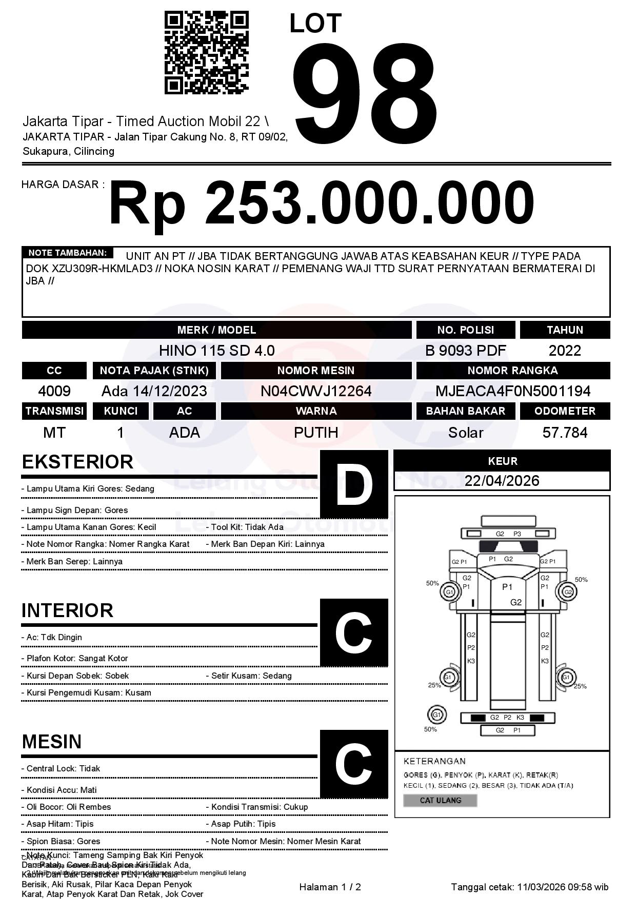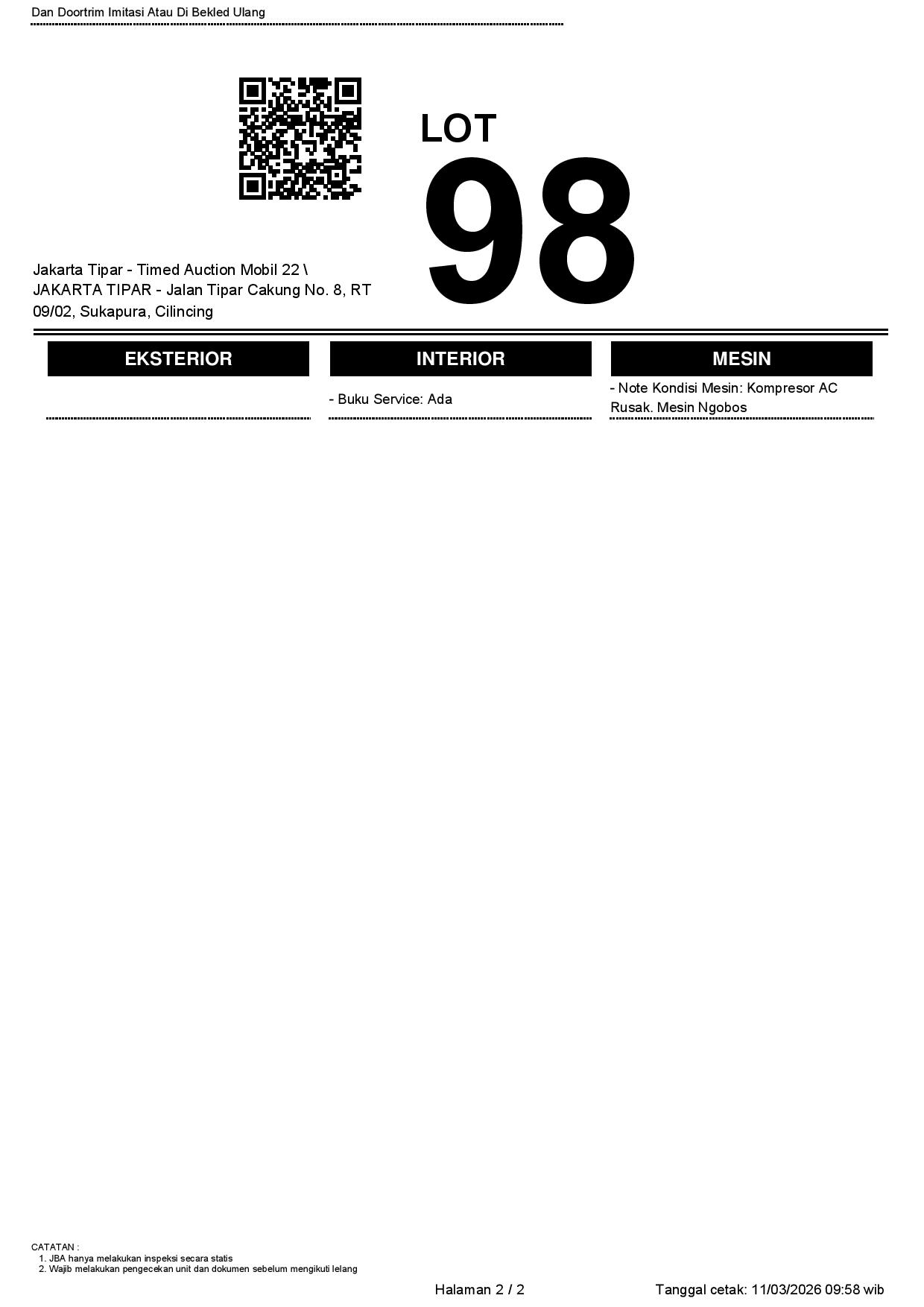 - Kondisi objek lelang dilelang apa adanya, baik kondisi fisik, mesin maupun legalitas kendaraan. Jika terdapat kekurangan/cacat baik yang terlihat maupun yang tidak terlihat, maka semua akan menjadi tanggung jawab/risiko Pemenang Lelang. Oleh karena itu, Pemenang Lelang melepaskan segala hak untuk menuntut dan/atau meminta ganti rugi atas hal tersebut kepada JBA.