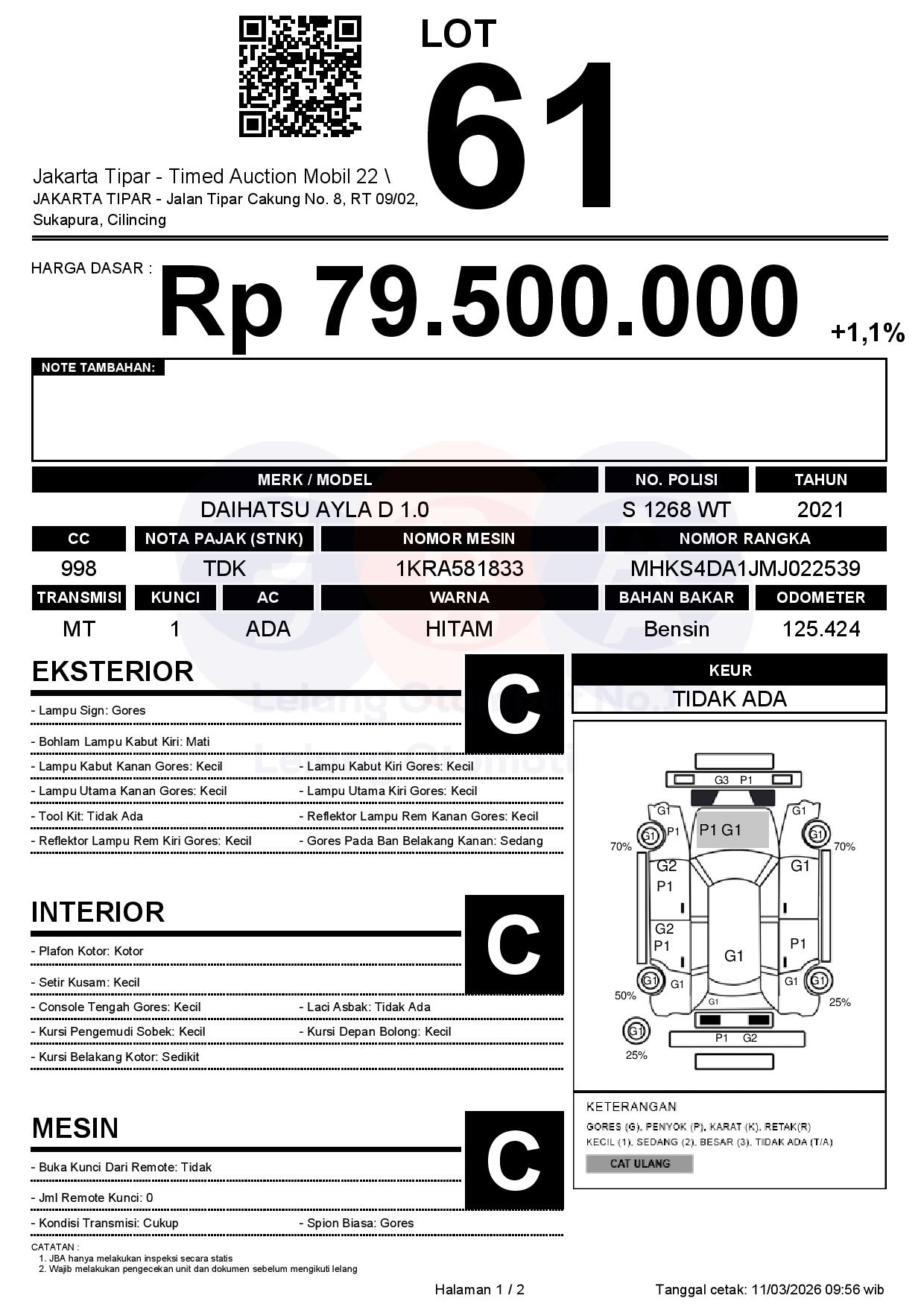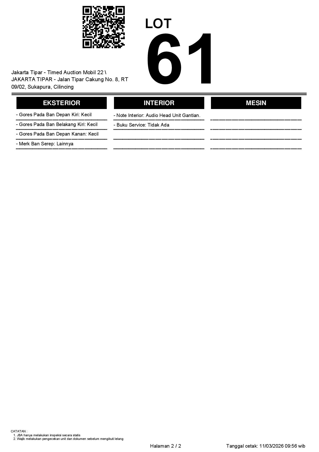 - Kondisi objek lelang dilelang apa adanya, baik kondisi fisik, mesin maupun legalitas kendaraan. Jika terdapat kekurangan/cacat baik yang terlihat maupun yang tidak terlihat, maka semua akan menjadi tanggung jawab/risiko Pemenang Lelang. Oleh karena itu, Pemenang Lelang melepaskan segala hak untuk menuntut dan/atau meminta ganti rugi atas hal tersebut kepada JBA.