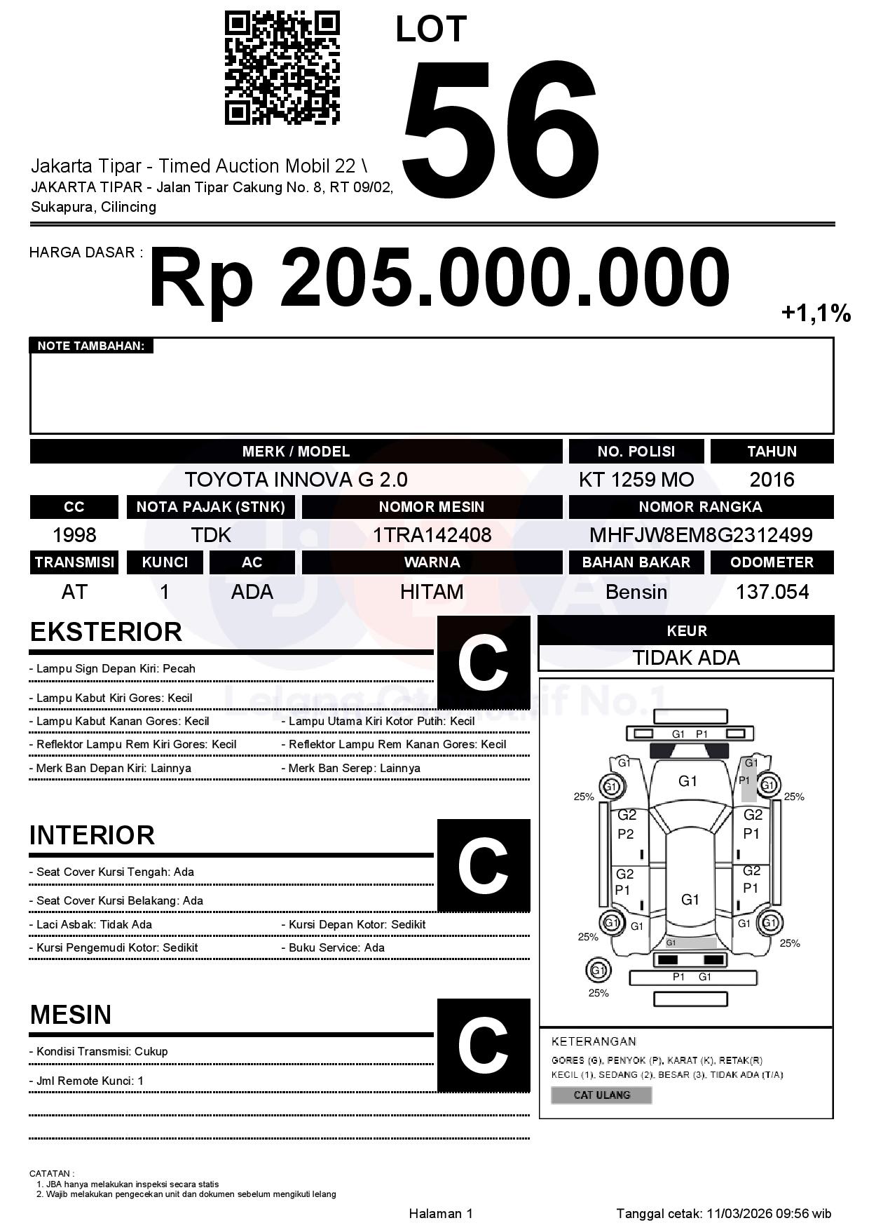 - Kondisi objek lelang dilelang apa adanya, baik kondisi fisik, mesin maupun legalitas kendaraan. Jika terdapat kekurangan/cacat baik yang terlihat maupun yang tidak terlihat, maka semua akan menjadi tanggung jawab/risiko Pemenang Lelang. Oleh karena itu, Pemenang Lelang melepaskan segala hak untuk menuntut dan/atau meminta ganti rugi atas hal tersebut kepada JBA.