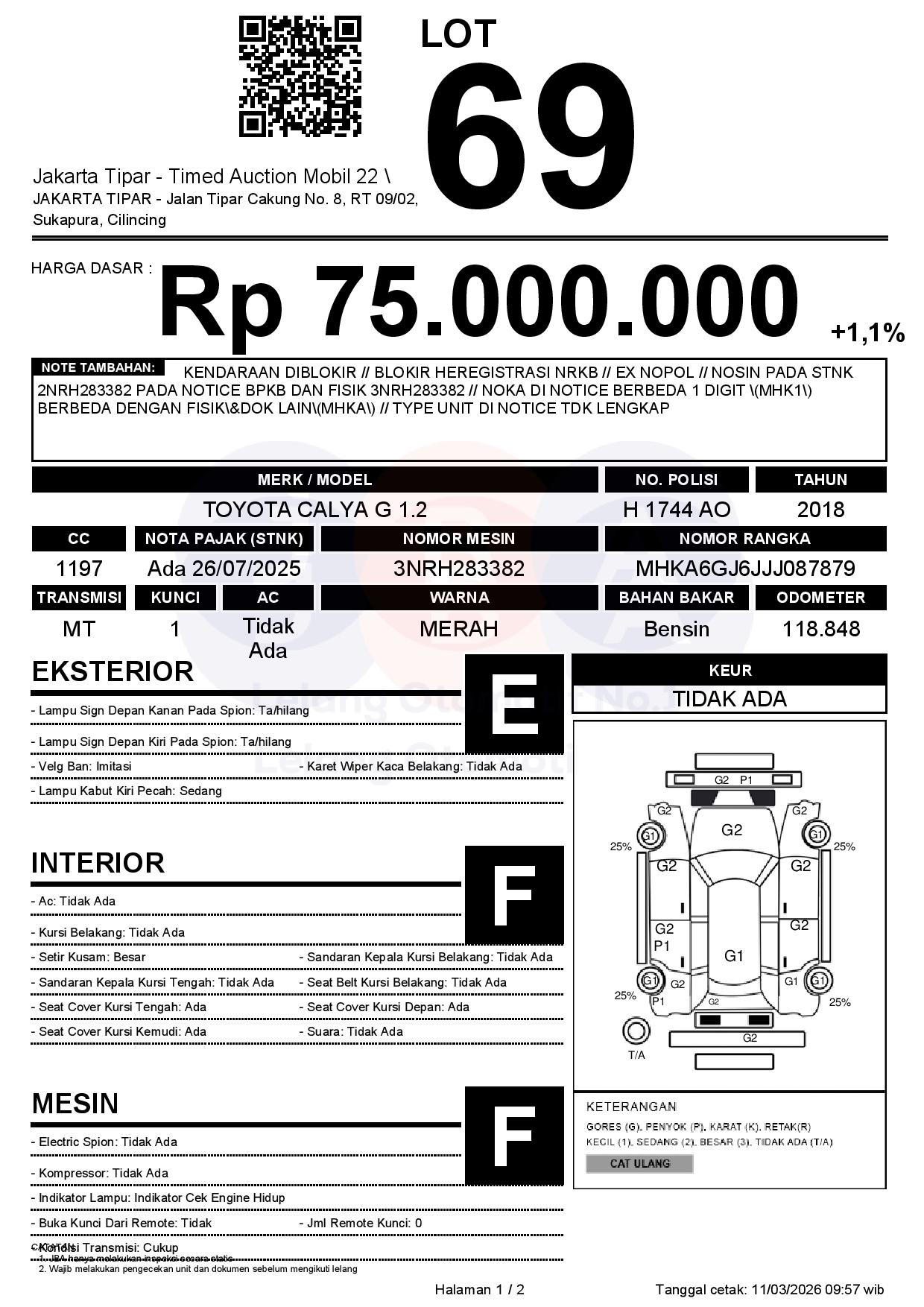 - Kondisi objek lelang dilelang apa adanya, baik kondisi fisik, mesin maupun legalitas kendaraan. Jika terdapat kekurangan/cacat baik yang terlihat maupun yang tidak terlihat, maka semua akan menjadi tanggung jawab/risiko Pemenang Lelang. Oleh karena itu, Pemenang Lelang melepaskan segala hak untuk menuntut dan/atau meminta ganti rugi atas hal tersebut kepada JBA.