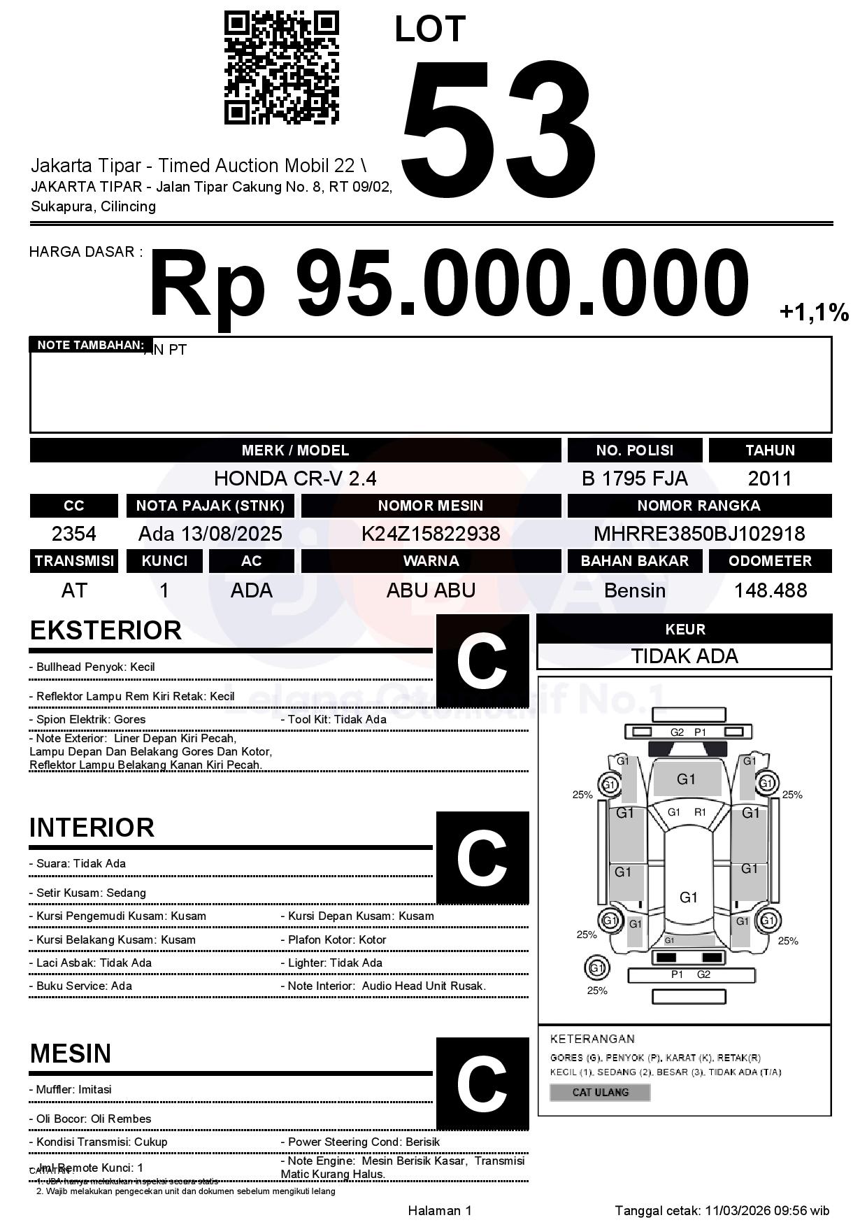 - Kondisi objek lelang dilelang apa adanya, baik kondisi fisik, mesin maupun legalitas kendaraan. Jika terdapat kekurangan/cacat baik yang terlihat maupun yang tidak terlihat, maka semua akan menjadi tanggung jawab/risiko Pemenang Lelang. Oleh karena itu, Pemenang Lelang melepaskan segala hak untuk menuntut dan/atau meminta ganti rugi atas hal tersebut kepada JBA.