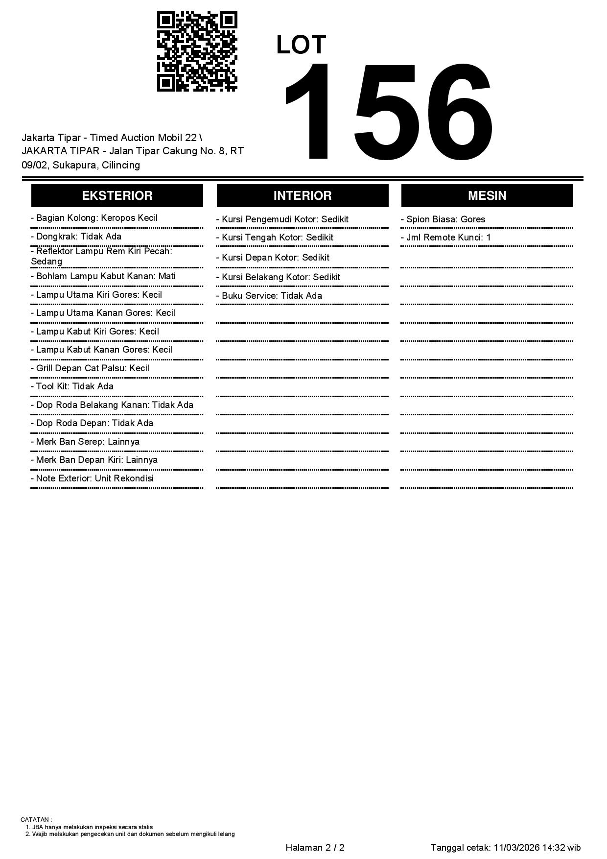 - Kondisi objek lelang dilelang apa adanya, baik kondisi fisik, mesin maupun legalitas kendaraan. Jika terdapat kekurangan/cacat baik yang terlihat maupun yang tidak terlihat, maka semua akan menjadi tanggung jawab/risiko Pemenang Lelang. Oleh karena itu, Pemenang Lelang melepaskan segala hak untuk menuntut dan/atau meminta ganti rugi atas hal tersebut kepada JBA.