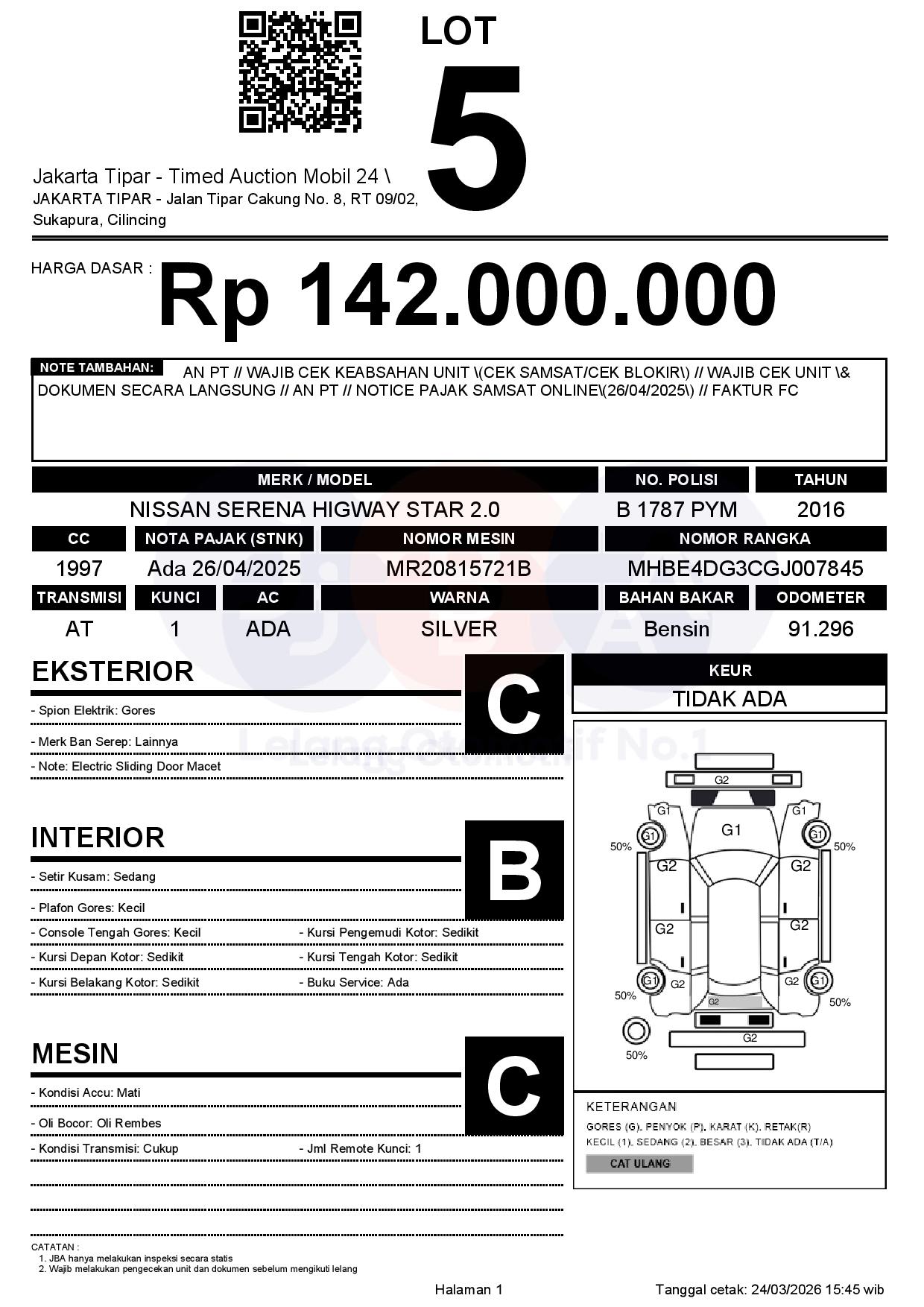 - Kondisi objek lelang dilelang apa adanya, baik kondisi fisik, mesin maupun legalitas kendaraan. Jika terdapat kekurangan/cacat baik yang terlihat maupun yang tidak terlihat, maka semua akan menjadi tanggung jawab/risiko Pemenang Lelang. Oleh karena itu, Pemenang Lelang melepaskan segala hak untuk menuntut dan/atau meminta ganti rugi atas hal tersebut kepada JBA.