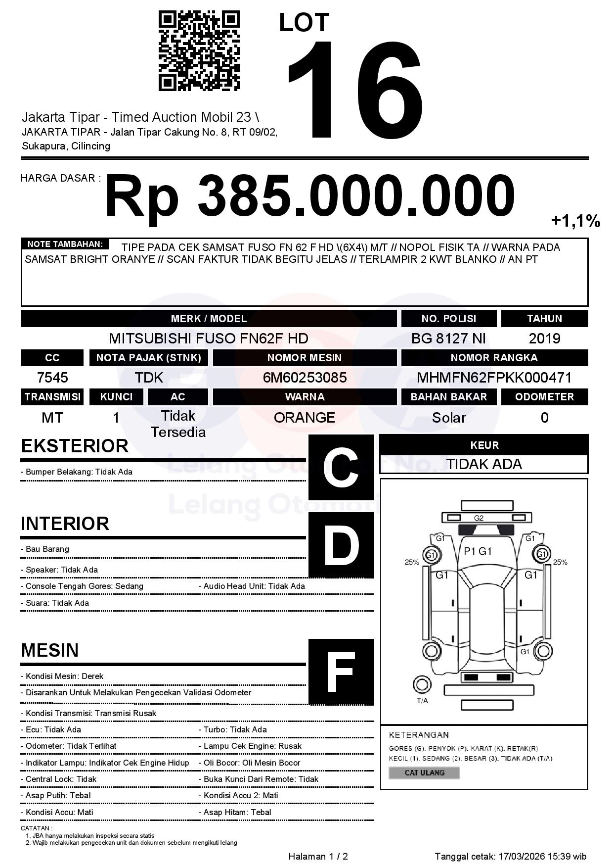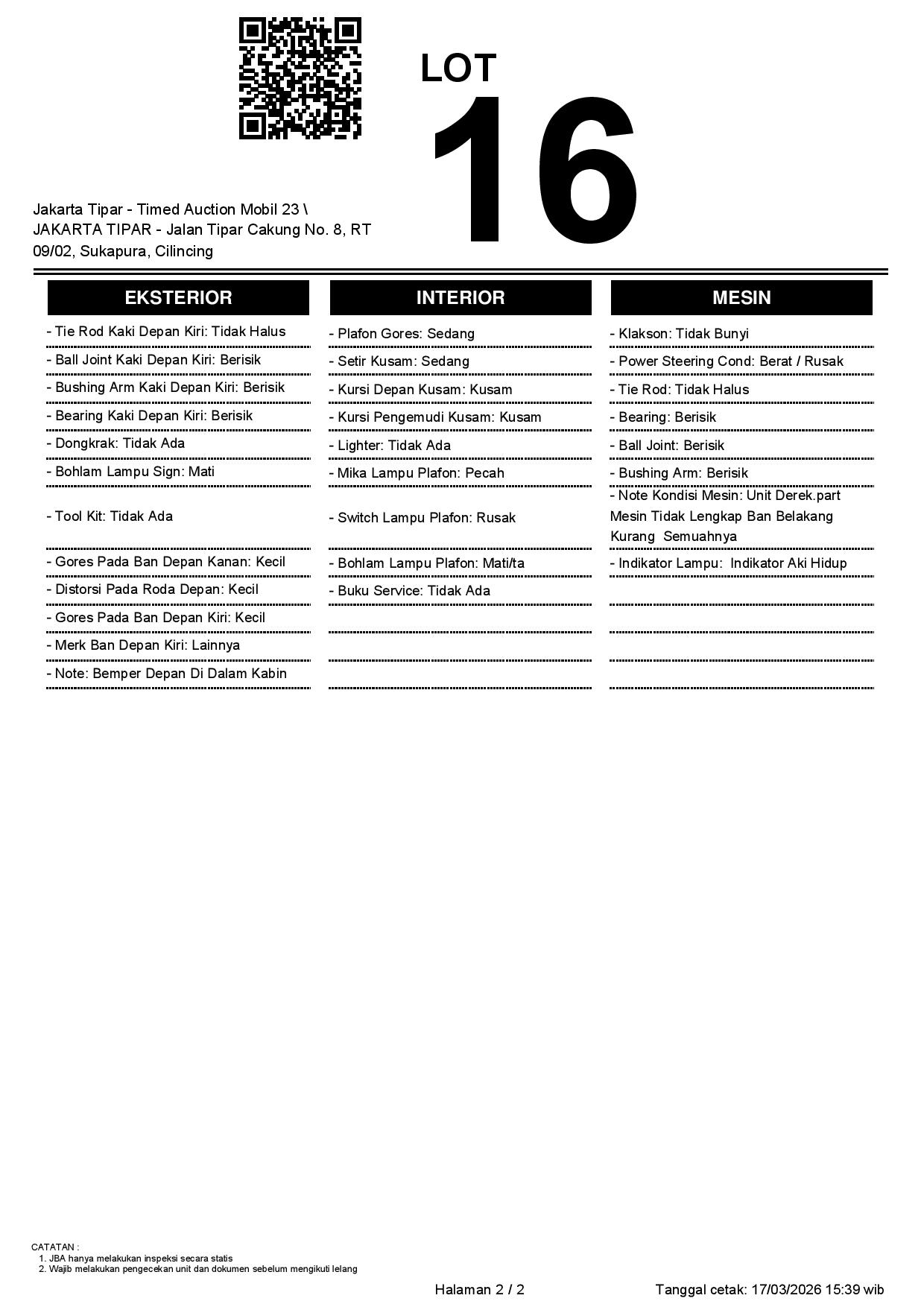 - Kondisi objek lelang dilelang apa adanya, baik kondisi fisik, mesin maupun legalitas kendaraan. Jika terdapat kekurangan/cacat baik yang terlihat maupun yang tidak terlihat, maka semua akan menjadi tanggung jawab/risiko Pemenang Lelang. Oleh karena itu, Pemenang Lelang melepaskan segala hak untuk menuntut dan/atau meminta ganti rugi atas hal tersebut kepada JBA.