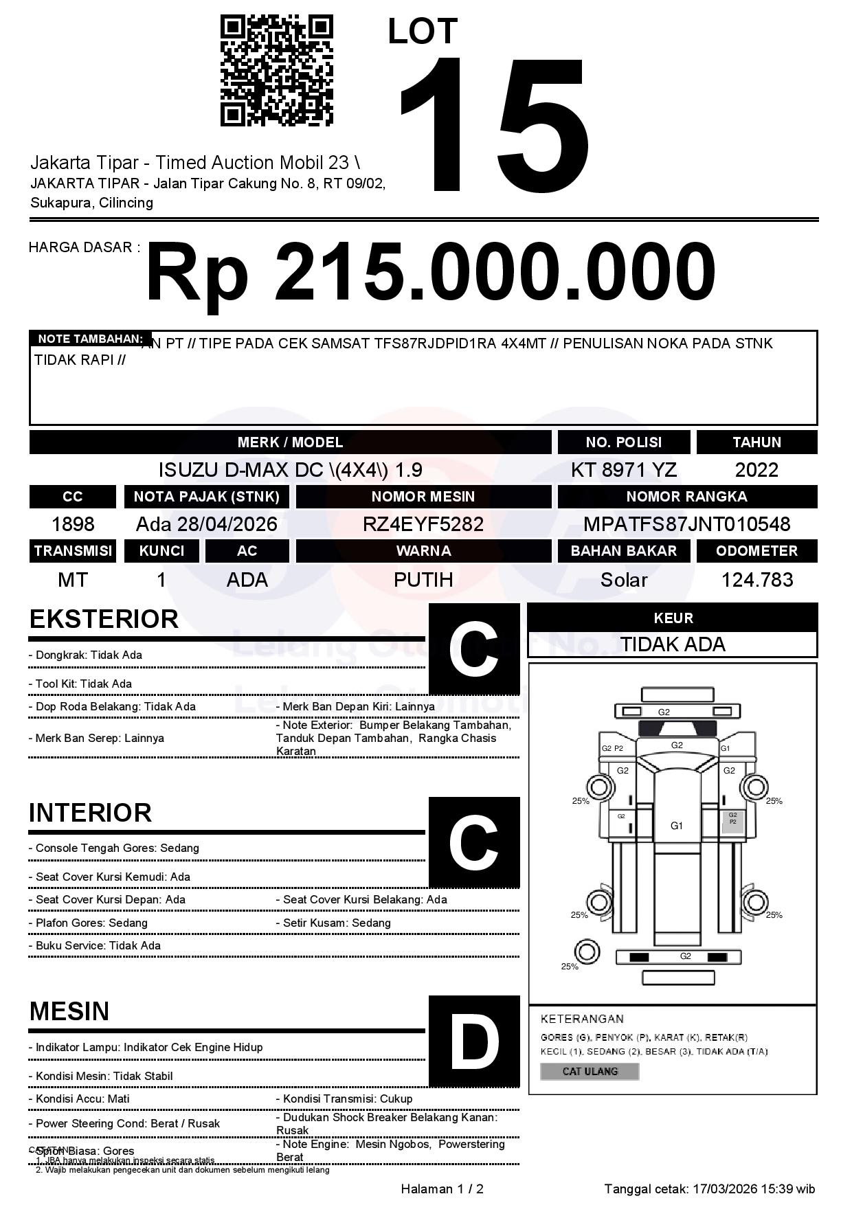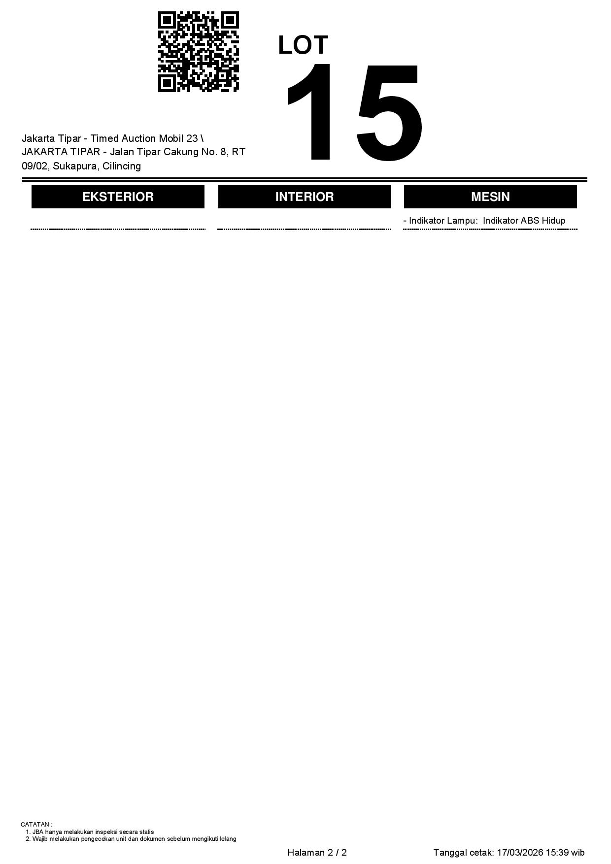 - Kondisi objek lelang dilelang apa adanya, baik kondisi fisik, mesin maupun legalitas kendaraan. Jika terdapat kekurangan/cacat baik yang terlihat maupun yang tidak terlihat, maka semua akan menjadi tanggung jawab/risiko Pemenang Lelang. Oleh karena itu, Pemenang Lelang melepaskan segala hak untuk menuntut dan/atau meminta ganti rugi atas hal tersebut kepada JBA.