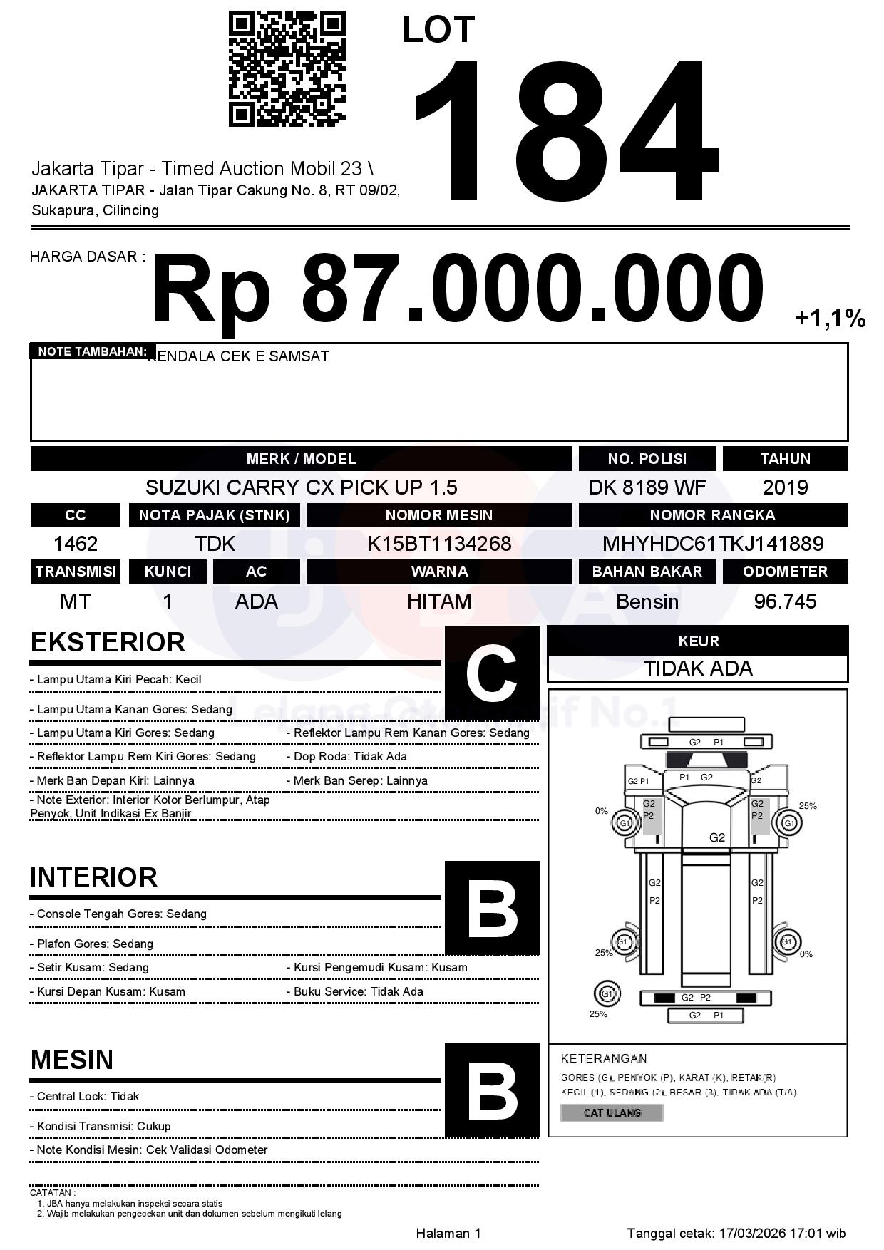 - Kondisi objek lelang dilelang apa adanya, baik kondisi fisik, mesin maupun legalitas kendaraan. Jika terdapat kekurangan/cacat baik yang terlihat maupun yang tidak terlihat, maka semua akan menjadi tanggung jawab/risiko Pemenang Lelang. Oleh karena itu, Pemenang Lelang melepaskan segala hak untuk menuntut dan/atau meminta ganti rugi atas hal tersebut kepada JBA.