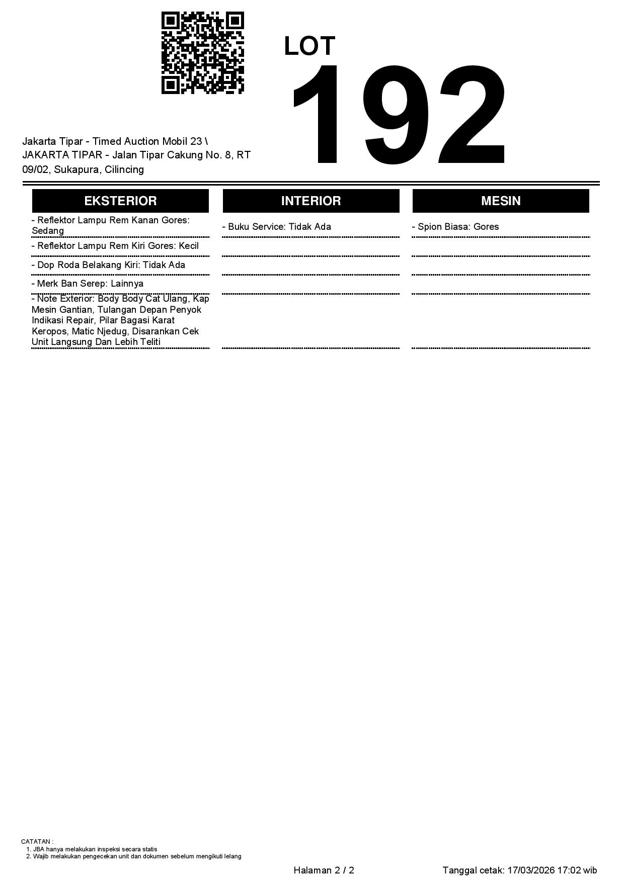 - Kondisi objek lelang dilelang apa adanya, baik kondisi fisik, mesin maupun legalitas kendaraan. Jika terdapat kekurangan/cacat baik yang terlihat maupun yang tidak terlihat, maka semua akan menjadi tanggung jawab/risiko Pemenang Lelang. Oleh karena itu, Pemenang Lelang melepaskan segala hak untuk menuntut dan/atau meminta ganti rugi atas hal tersebut kepada JBA.