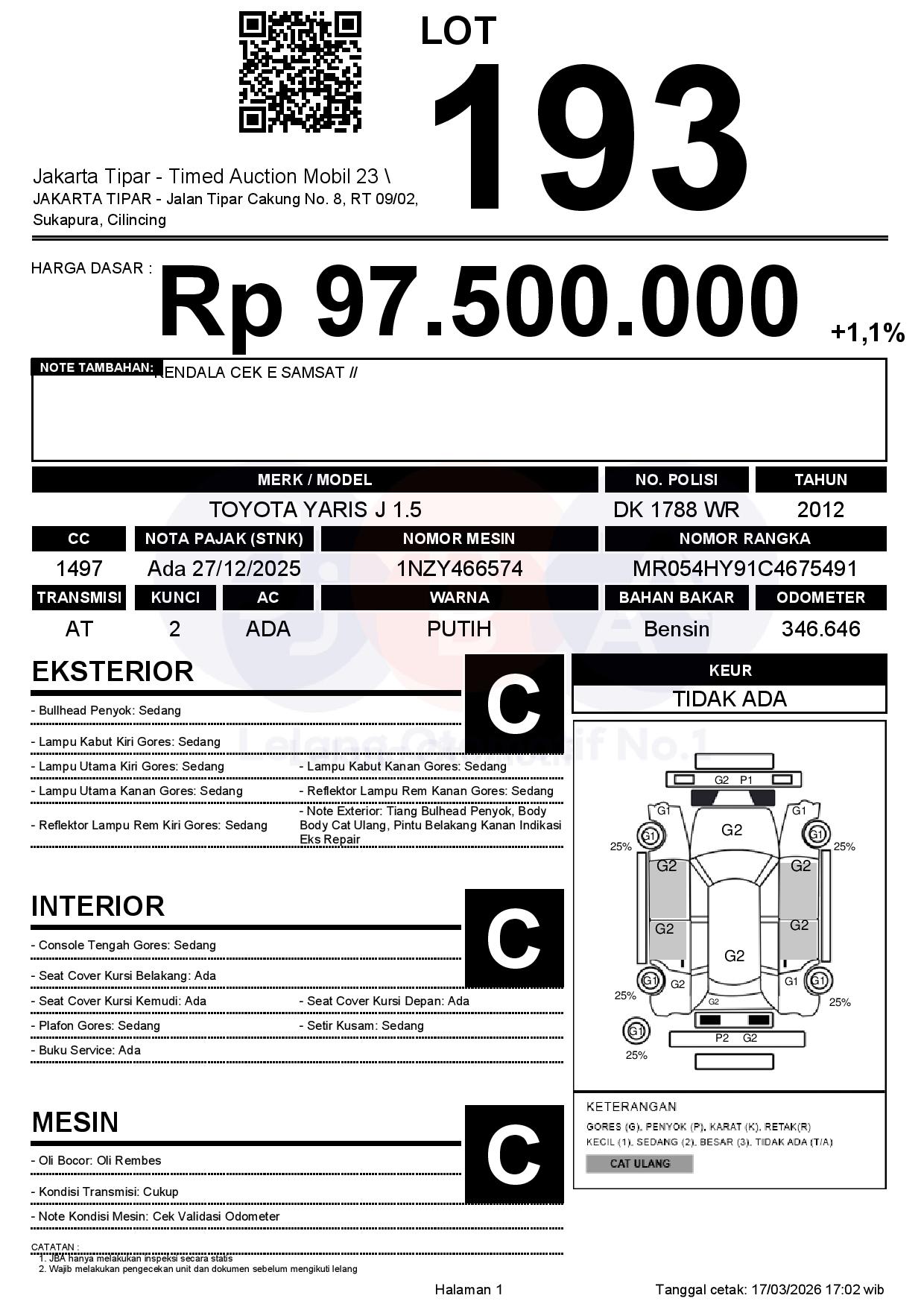 - Kondisi objek lelang dilelang apa adanya, baik kondisi fisik, mesin maupun legalitas kendaraan. Jika terdapat kekurangan/cacat baik yang terlihat maupun yang tidak terlihat, maka semua akan menjadi tanggung jawab/risiko Pemenang Lelang. Oleh karena itu, Pemenang Lelang melepaskan segala hak untuk menuntut dan/atau meminta ganti rugi atas hal tersebut kepada JBA.