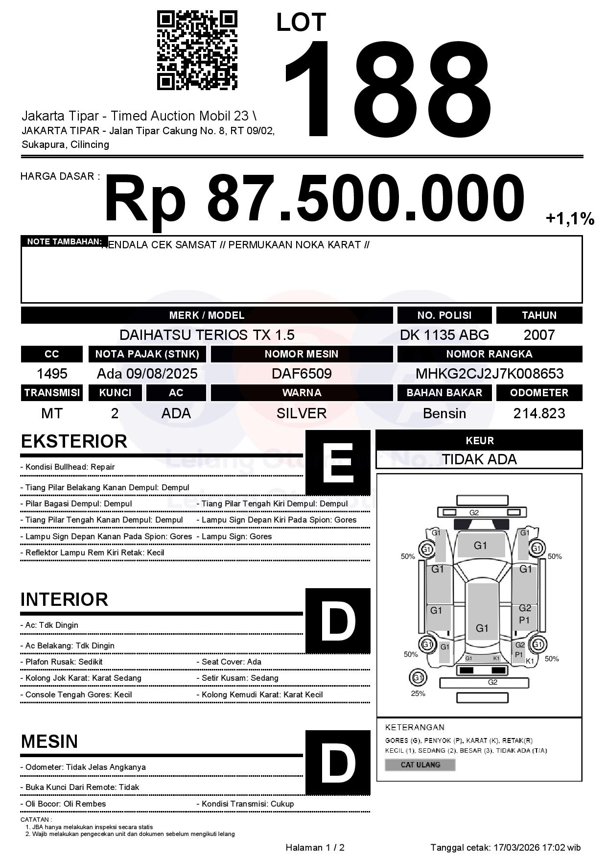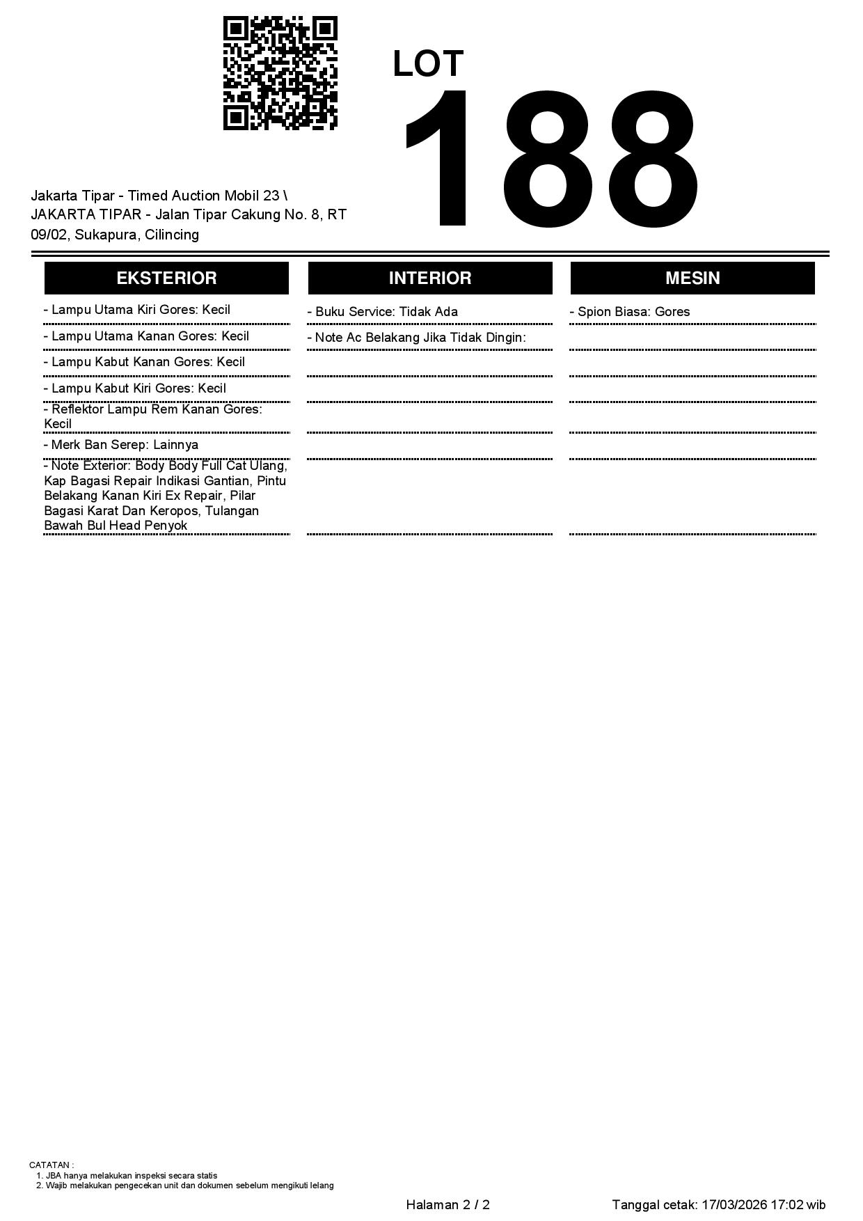 - Kondisi objek lelang dilelang apa adanya, baik kondisi fisik, mesin maupun legalitas kendaraan. Jika terdapat kekurangan/cacat baik yang terlihat maupun yang tidak terlihat, maka semua akan menjadi tanggung jawab/risiko Pemenang Lelang. Oleh karena itu, Pemenang Lelang melepaskan segala hak untuk menuntut dan/atau meminta ganti rugi atas hal tersebut kepada JBA.