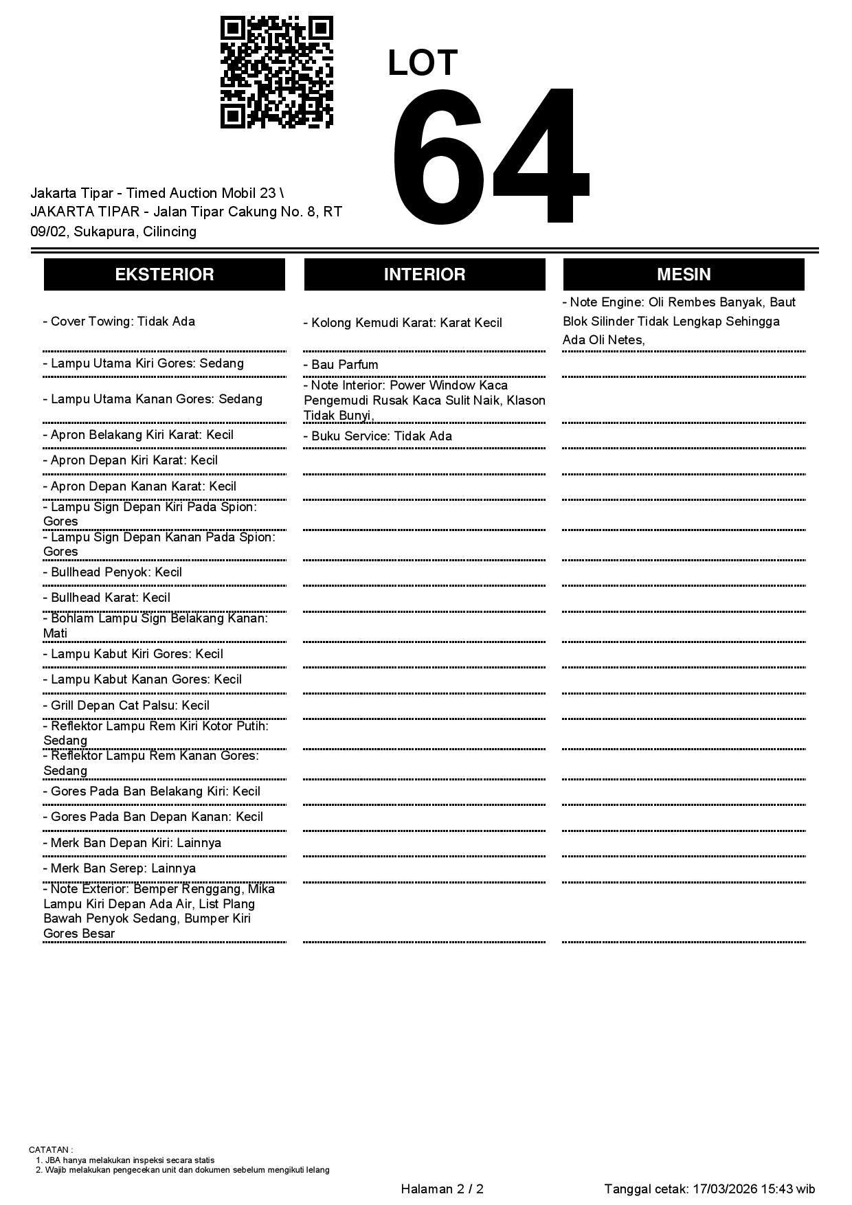- Kondisi objek lelang dilelang apa adanya, baik kondisi fisik, mesin maupun legalitas kendaraan. Jika terdapat kekurangan/cacat baik yang terlihat maupun yang tidak terlihat, maka semua akan menjadi tanggung jawab/risiko Pemenang Lelang. Oleh karena itu, Pemenang Lelang melepaskan segala hak untuk menuntut dan/atau meminta ganti rugi atas hal tersebut kepada JBA.
