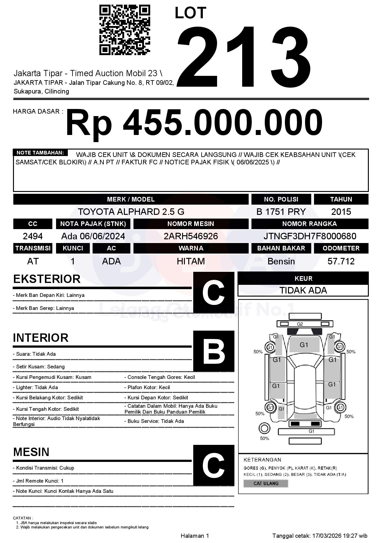 - Kondisi objek lelang dilelang apa adanya, baik kondisi fisik, mesin maupun legalitas kendaraan. Jika terdapat kekurangan/cacat baik yang terlihat maupun yang tidak terlihat, maka semua akan menjadi tanggung jawab/risiko Pemenang Lelang. Oleh karena itu, Pemenang Lelang melepaskan segala hak untuk menuntut dan/atau meminta ganti rugi atas hal tersebut kepada JBA.