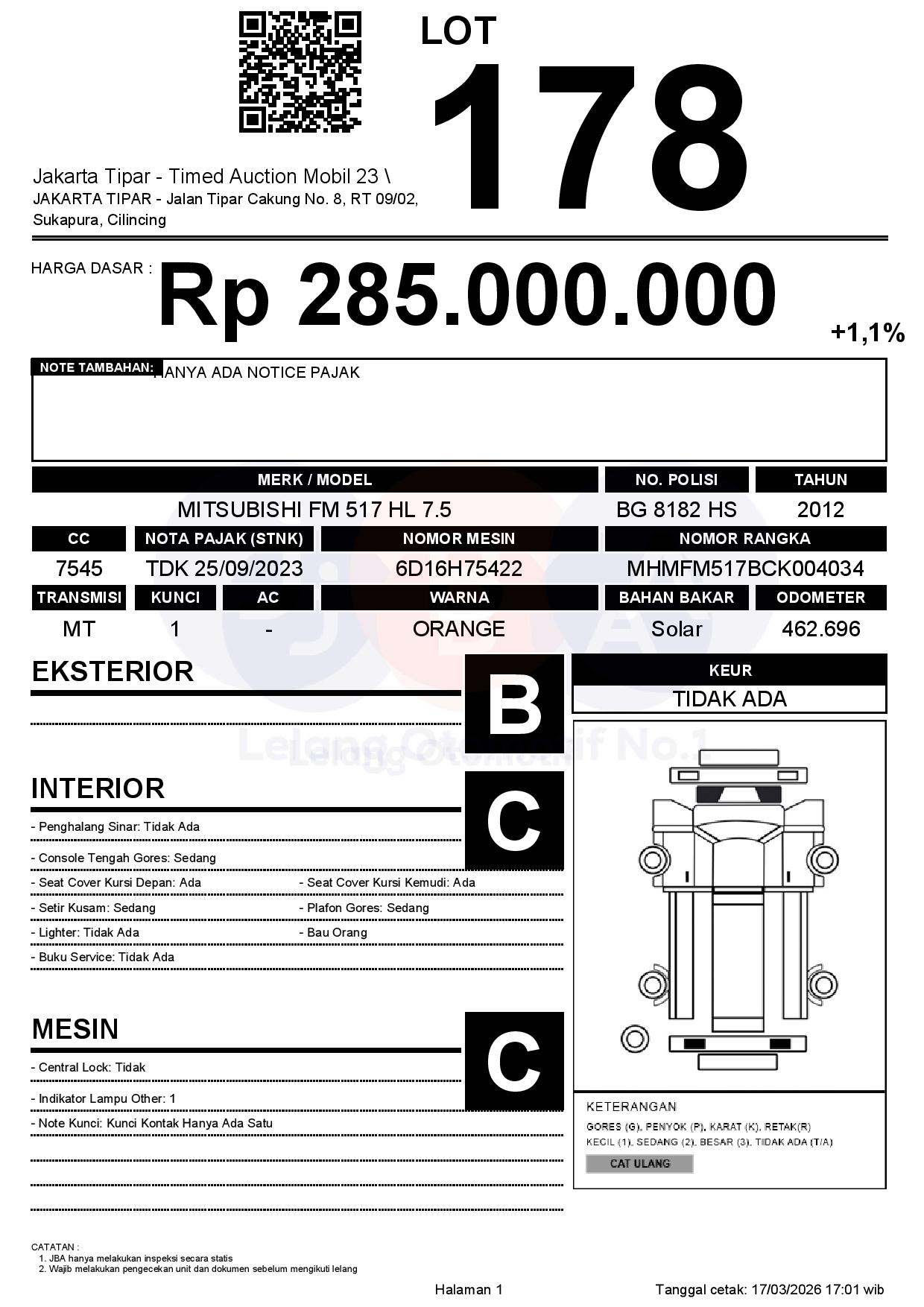 - Kondisi objek lelang dilelang apa adanya, baik kondisi fisik, mesin maupun legalitas kendaraan. Jika terdapat kekurangan/cacat baik yang terlihat maupun yang tidak terlihat, maka semua akan menjadi tanggung jawab/risiko Pemenang Lelang. Oleh karena itu, Pemenang Lelang melepaskan segala hak untuk menuntut dan/atau meminta ganti rugi atas hal tersebut kepada JBA.