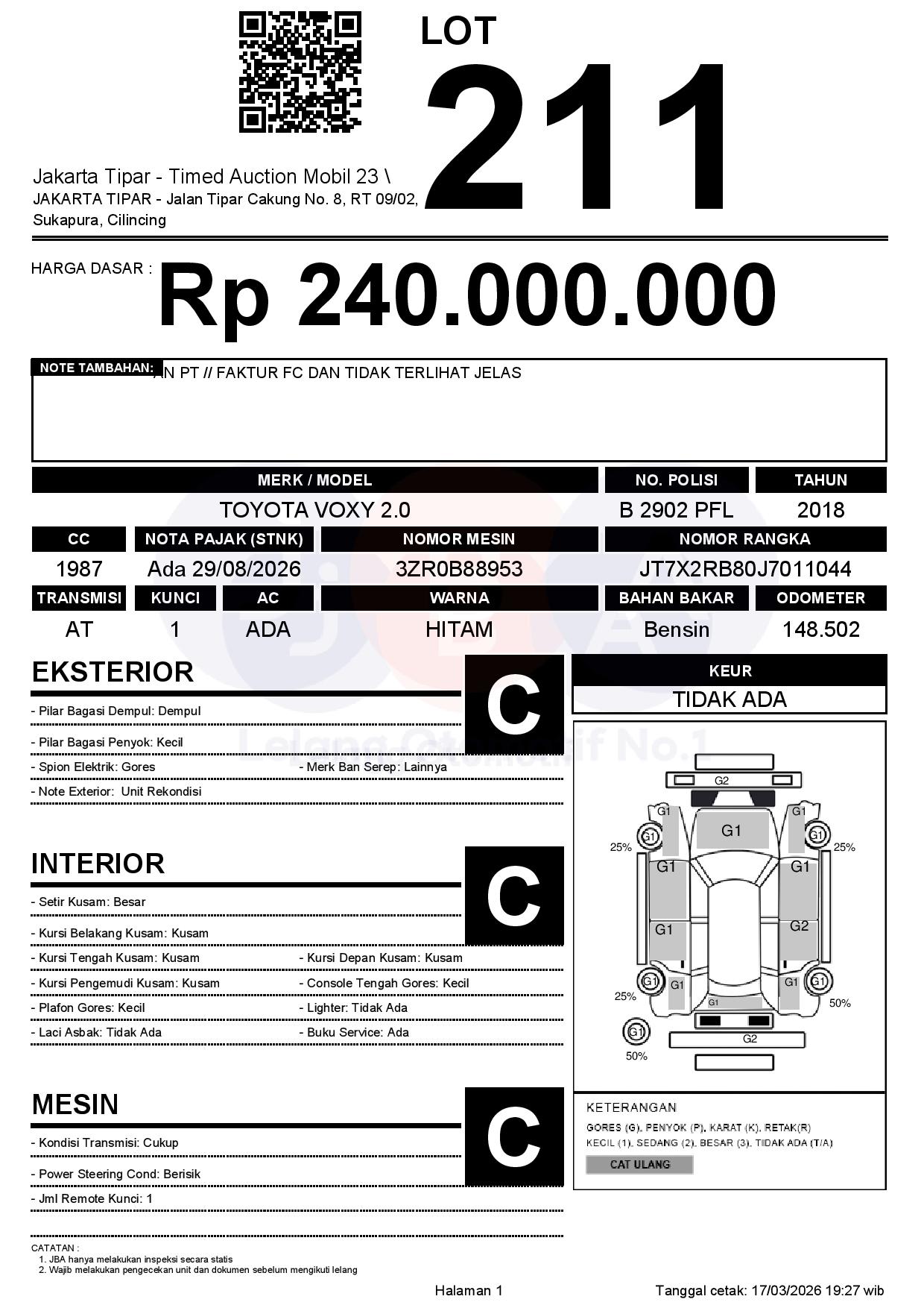 - Kondisi objek lelang dilelang apa adanya, baik kondisi fisik, mesin maupun legalitas kendaraan. Jika terdapat kekurangan/cacat baik yang terlihat maupun yang tidak terlihat, maka semua akan menjadi tanggung jawab/risiko Pemenang Lelang. Oleh karena itu, Pemenang Lelang melepaskan segala hak untuk menuntut dan/atau meminta ganti rugi atas hal tersebut kepada JBA.