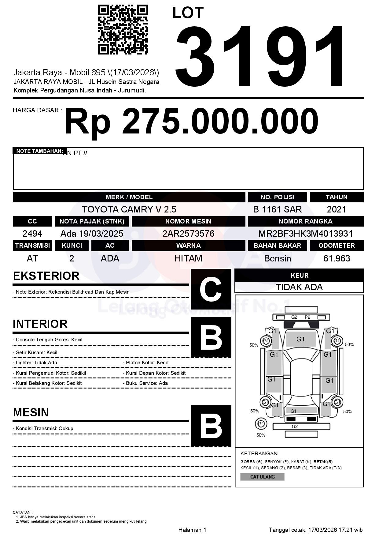 - Kondisi objek lelang dilelang apa adanya, baik kondisi fisik, mesin maupun legalitas kendaraan. Jika terdapat kekurangan/cacat baik yang terlihat maupun yang tidak terlihat, maka semua akan menjadi tanggung jawab/risiko Pemenang Lelang. Oleh karena itu, Pemenang Lelang melepaskan segala hak untuk menuntut dan/atau meminta ganti rugi atas hal tersebut kepada JBA.