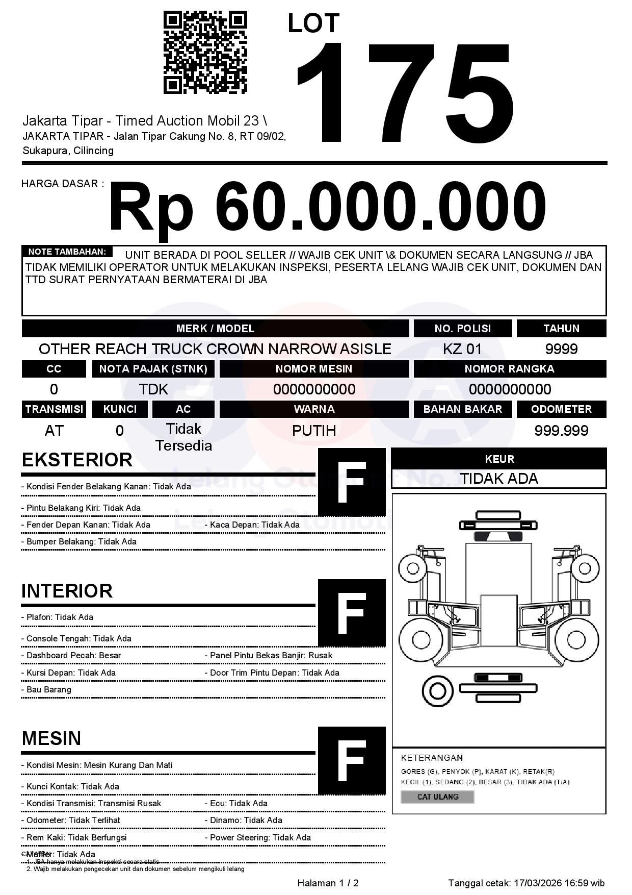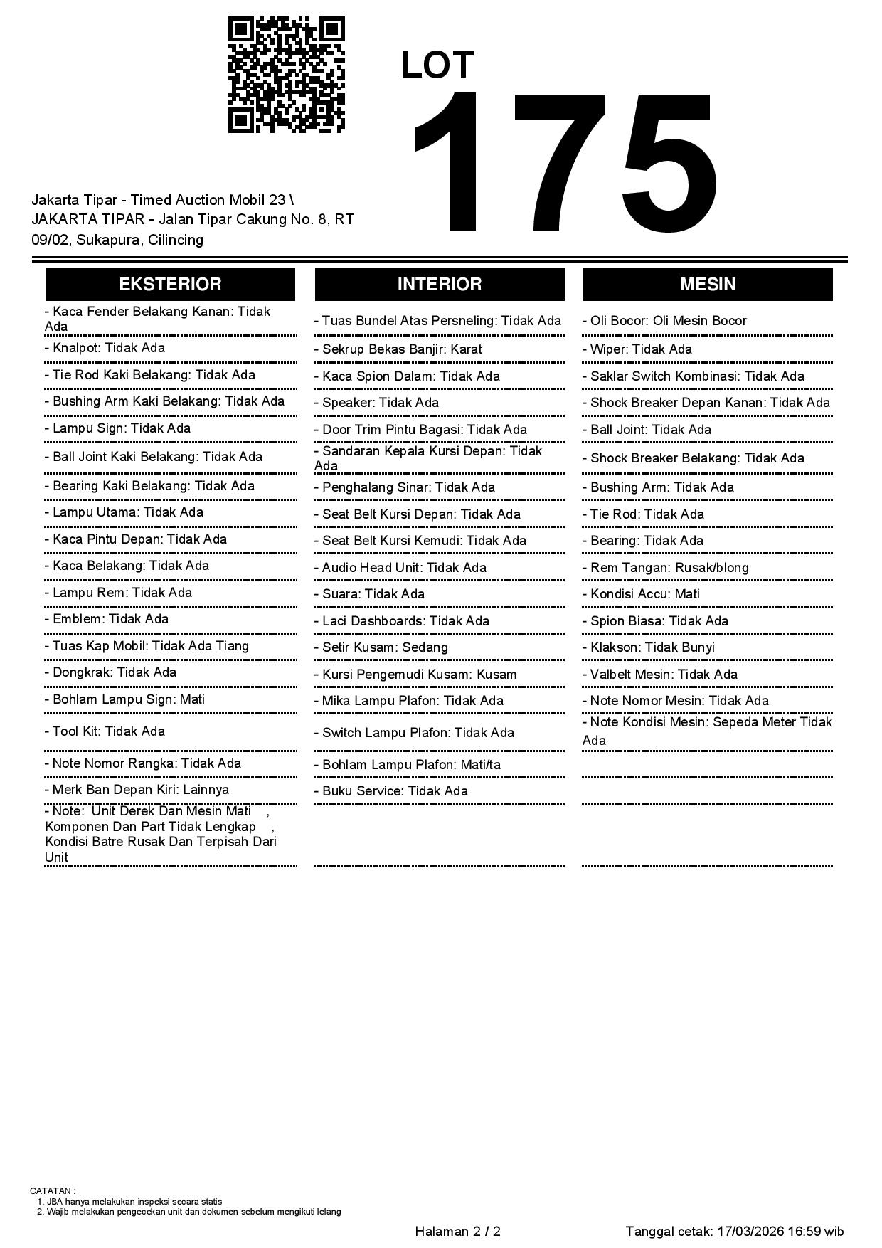 - Kondisi objek lelang dilelang apa adanya, baik kondisi fisik, mesin maupun legalitas kendaraan. Jika terdapat kekurangan/cacat baik yang terlihat maupun yang tidak terlihat, maka semua akan menjadi tanggung jawab/risiko Pemenang Lelang. Oleh karena itu, Pemenang Lelang melepaskan segala hak untuk menuntut dan/atau meminta ganti rugi atas hal tersebut kepada JBA.