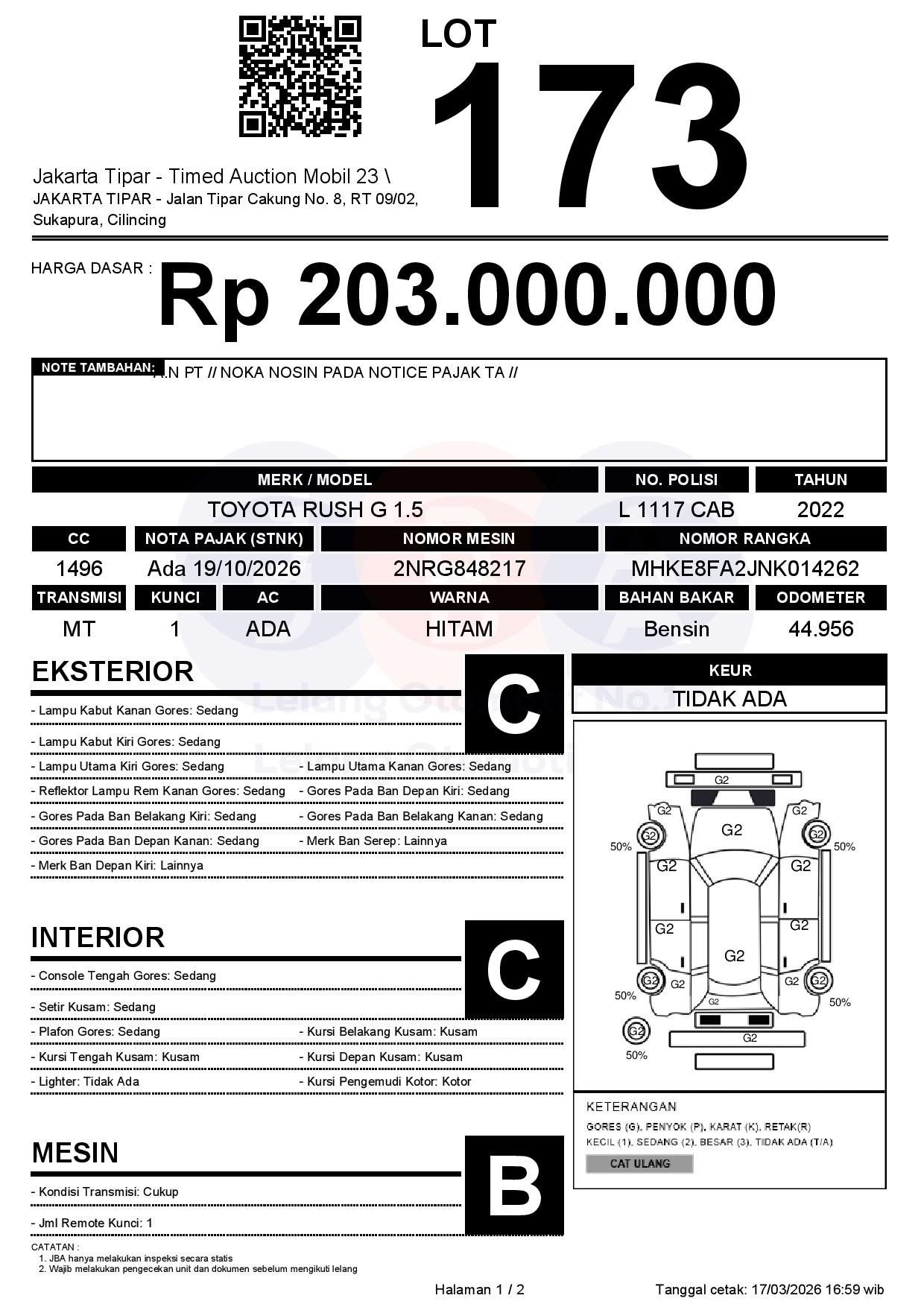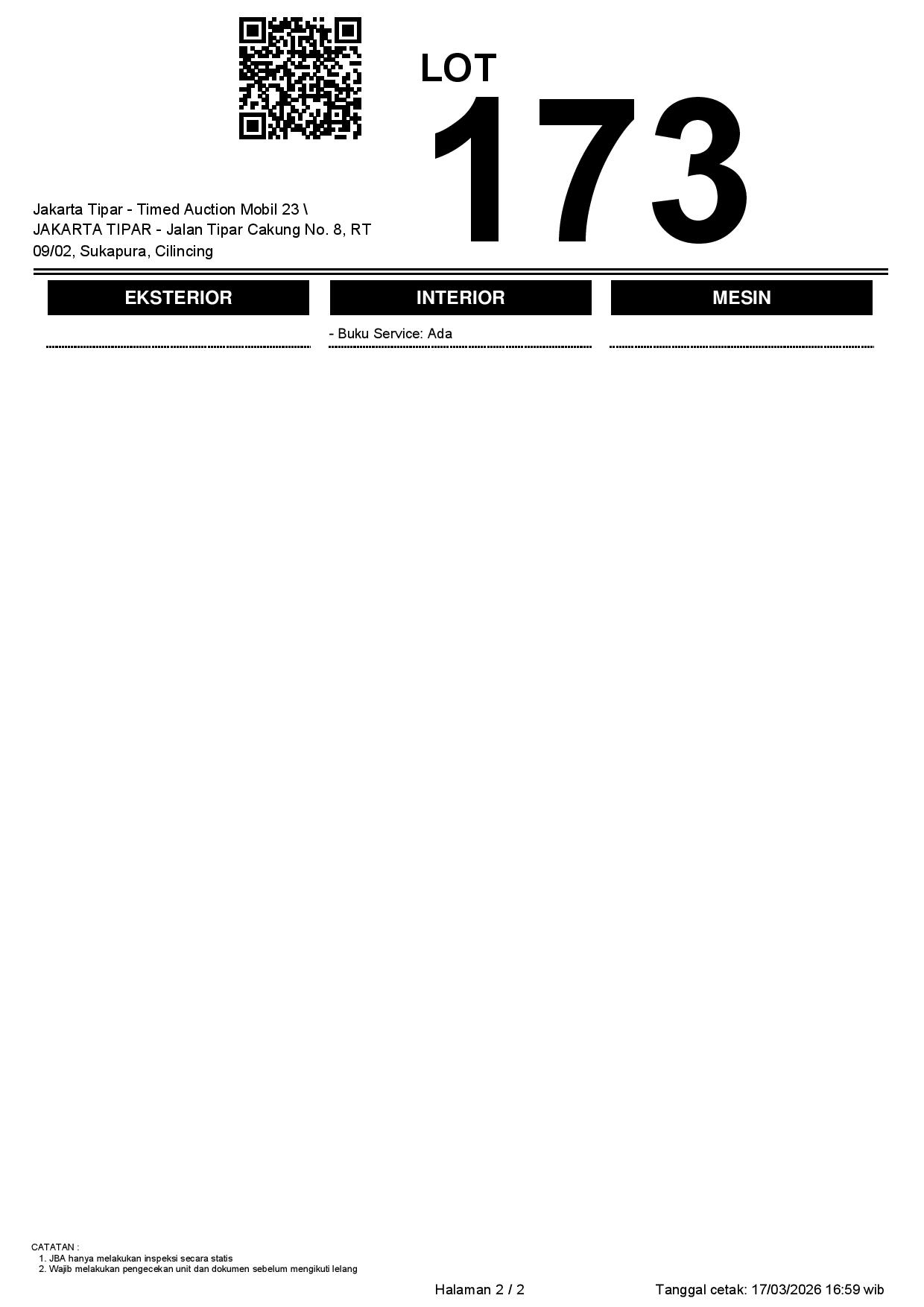 - Kondisi objek lelang dilelang apa adanya, baik kondisi fisik, mesin maupun legalitas kendaraan. Jika terdapat kekurangan/cacat baik yang terlihat maupun yang tidak terlihat, maka semua akan menjadi tanggung jawab/risiko Pemenang Lelang. Oleh karena itu, Pemenang Lelang melepaskan segala hak untuk menuntut dan/atau meminta ganti rugi atas hal tersebut kepada JBA.