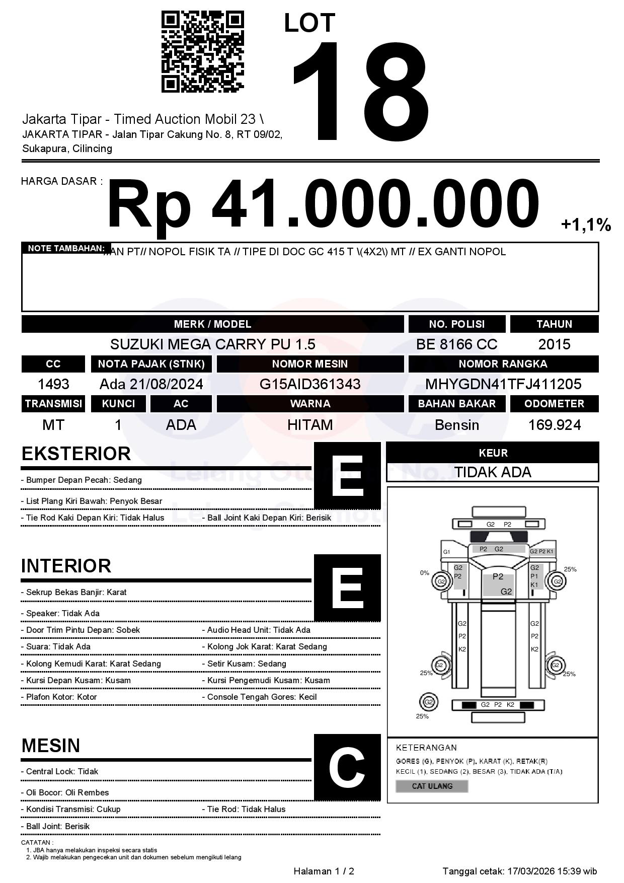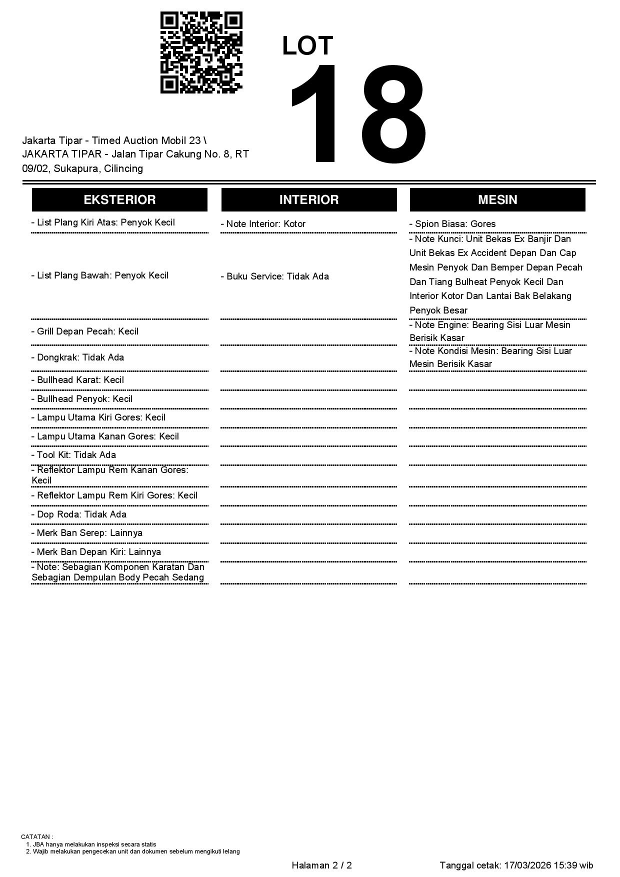 - Kondisi objek lelang dilelang apa adanya, baik kondisi fisik, mesin maupun legalitas kendaraan. Jika terdapat kekurangan/cacat baik yang terlihat maupun yang tidak terlihat, maka semua akan menjadi tanggung jawab/risiko Pemenang Lelang. Oleh karena itu, Pemenang Lelang melepaskan segala hak untuk menuntut dan/atau meminta ganti rugi atas hal tersebut kepada JBA.