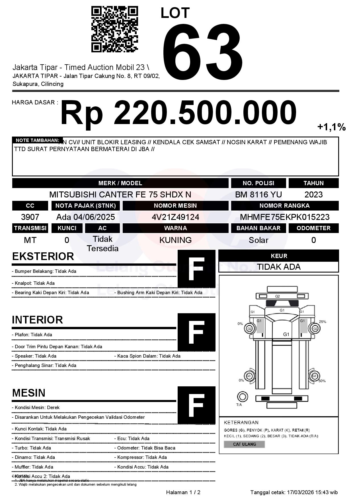 - Kondisi objek lelang dilelang apa adanya, baik kondisi fisik, mesin maupun legalitas kendaraan. Jika terdapat kekurangan/cacat baik yang terlihat maupun yang tidak terlihat, maka semua akan menjadi tanggung jawab/risiko Pemenang Lelang. Oleh karena itu, Pemenang Lelang melepaskan segala hak untuk menuntut dan/atau meminta ganti rugi atas hal tersebut kepada JBA.