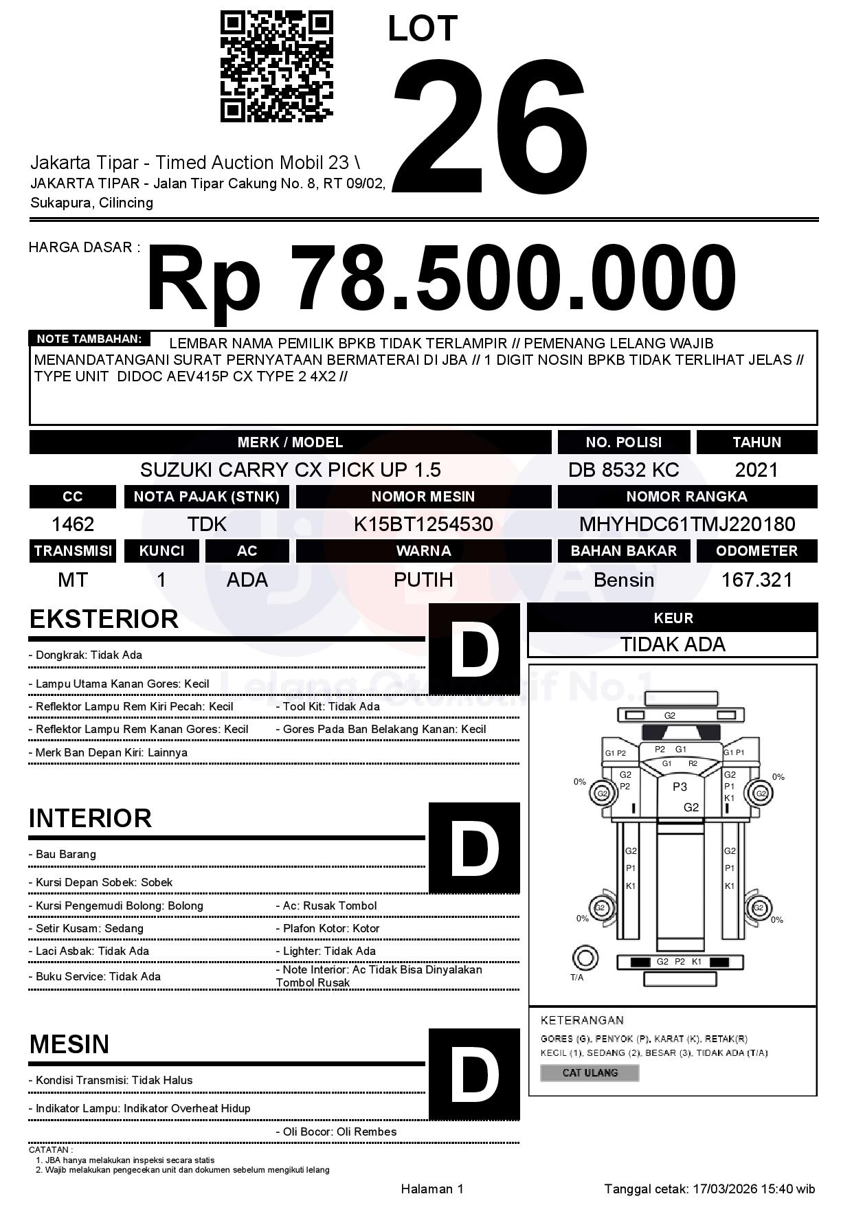 - Kondisi objek lelang dilelang apa adanya, baik kondisi fisik, mesin maupun legalitas kendaraan. Jika terdapat kekurangan/cacat baik yang terlihat maupun yang tidak terlihat, maka semua akan menjadi tanggung jawab/risiko Pemenang Lelang. Oleh karena itu, Pemenang Lelang melepaskan segala hak untuk menuntut dan/atau meminta ganti rugi atas hal tersebut kepada JBA.