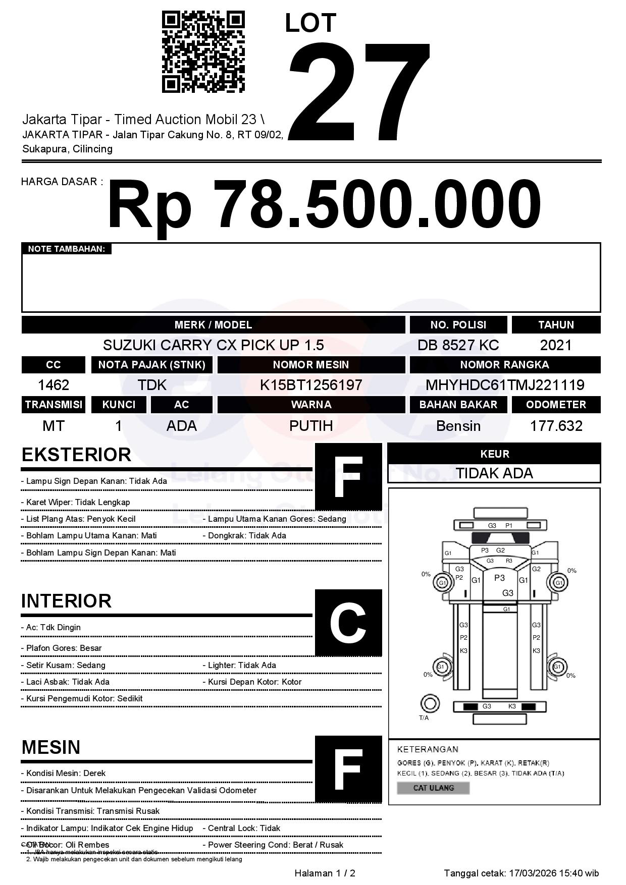 - Kondisi objek lelang dilelang apa adanya, baik kondisi fisik, mesin maupun legalitas kendaraan. Jika terdapat kekurangan/cacat baik yang terlihat maupun yang tidak terlihat, maka semua akan menjadi tanggung jawab/risiko Pemenang Lelang. Oleh karena itu, Pemenang Lelang melepaskan segala hak untuk menuntut dan/atau meminta ganti rugi atas hal tersebut kepada JBA.
