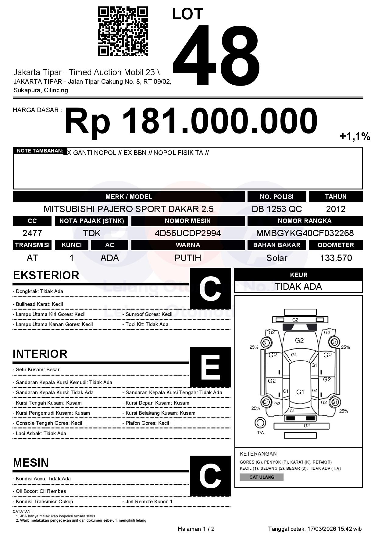 - Kondisi objek lelang dilelang apa adanya, baik kondisi fisik, mesin maupun legalitas kendaraan. Jika terdapat kekurangan/cacat baik yang terlihat maupun yang tidak terlihat, maka semua akan menjadi tanggung jawab/risiko Pemenang Lelang. Oleh karena itu, Pemenang Lelang melepaskan segala hak untuk menuntut dan/atau meminta ganti rugi atas hal tersebut kepada JBA.
