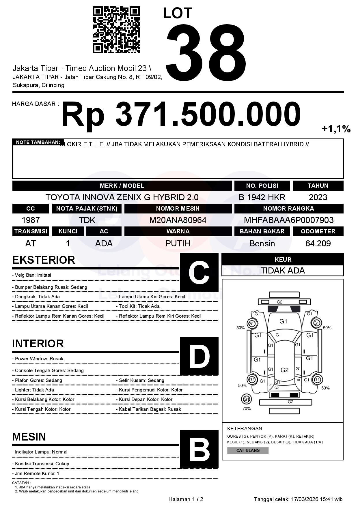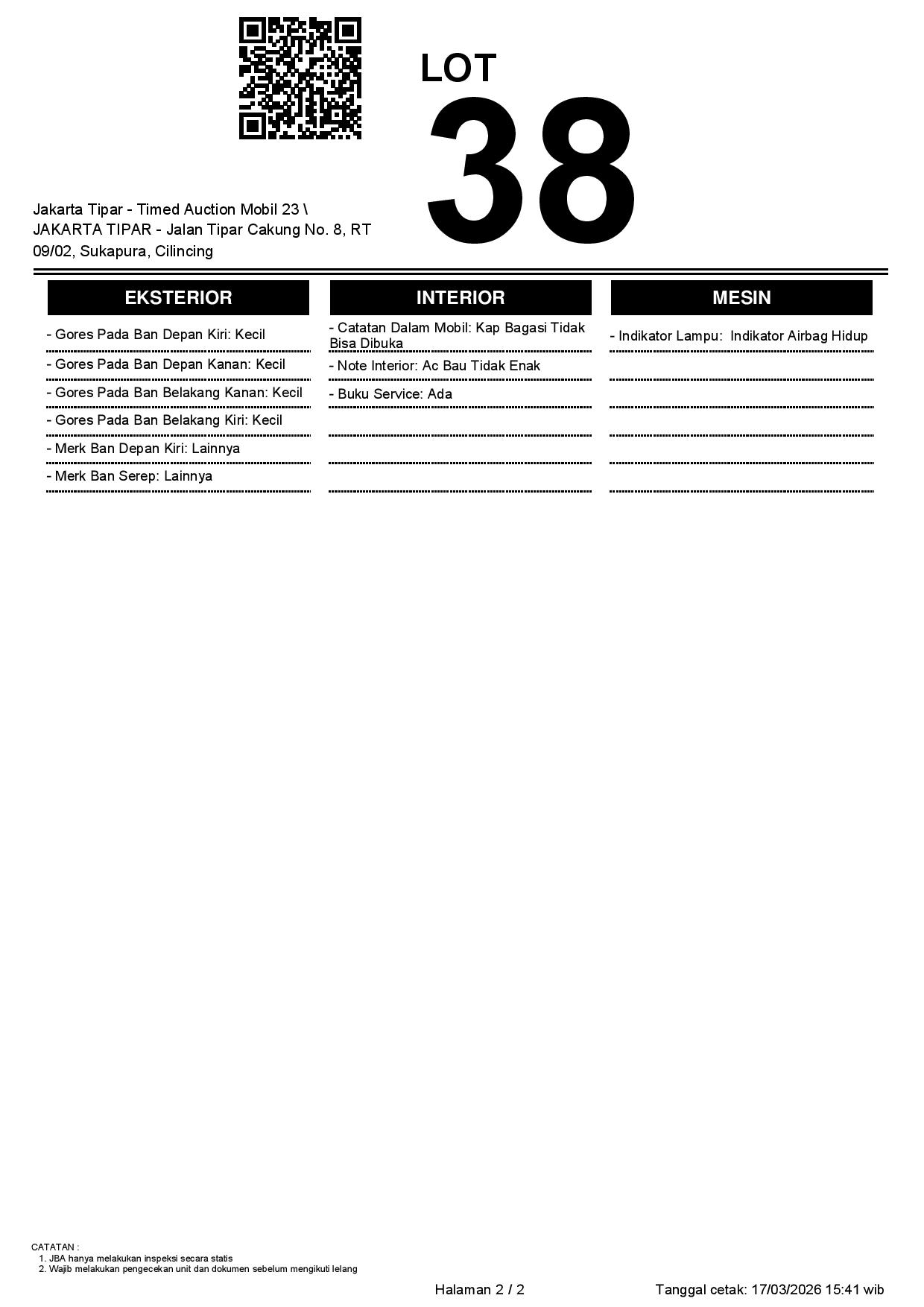 - Kondisi objek lelang dilelang apa adanya, baik kondisi fisik, mesin maupun legalitas kendaraan. Jika terdapat kekurangan/cacat baik yang terlihat maupun yang tidak terlihat, maka semua akan menjadi tanggung jawab/risiko Pemenang Lelang. Oleh karena itu, Pemenang Lelang melepaskan segala hak untuk menuntut dan/atau meminta ganti rugi atas hal tersebut kepada JBA.