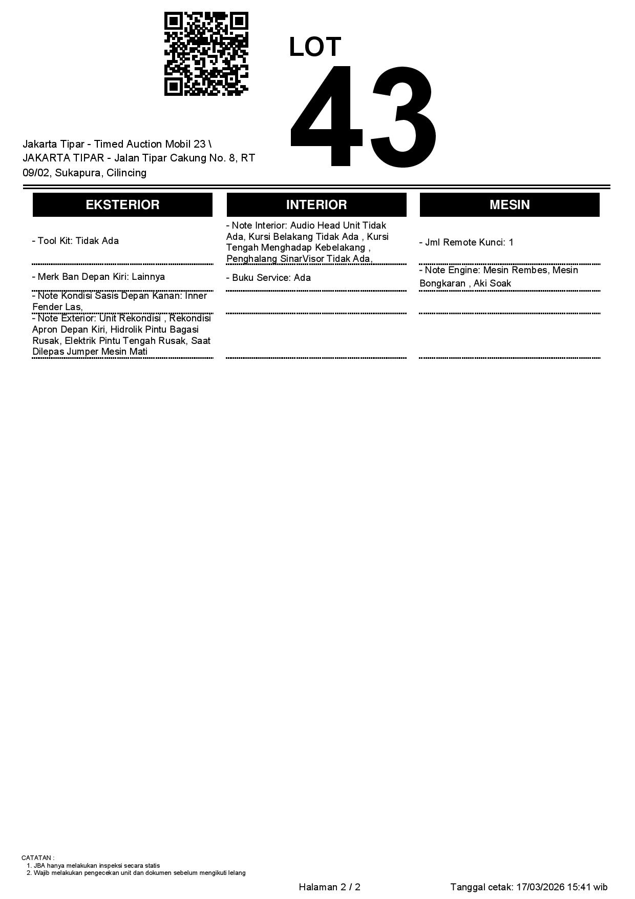 - Kondisi objek lelang dilelang apa adanya, baik kondisi fisik, mesin maupun legalitas kendaraan. Jika terdapat kekurangan/cacat baik yang terlihat maupun yang tidak terlihat, maka semua akan menjadi tanggung jawab/risiko Pemenang Lelang. Oleh karena itu, Pemenang Lelang melepaskan segala hak untuk menuntut dan/atau meminta ganti rugi atas hal tersebut kepada JBA.