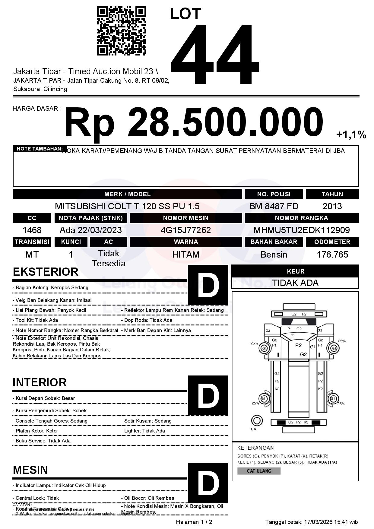 - Kondisi objek lelang dilelang apa adanya, baik kondisi fisik, mesin maupun legalitas kendaraan. Jika terdapat kekurangan/cacat baik yang terlihat maupun yang tidak terlihat, maka semua akan menjadi tanggung jawab/risiko Pemenang Lelang. Oleh karena itu, Pemenang Lelang melepaskan segala hak untuk menuntut dan/atau meminta ganti rugi atas hal tersebut kepada JBA.