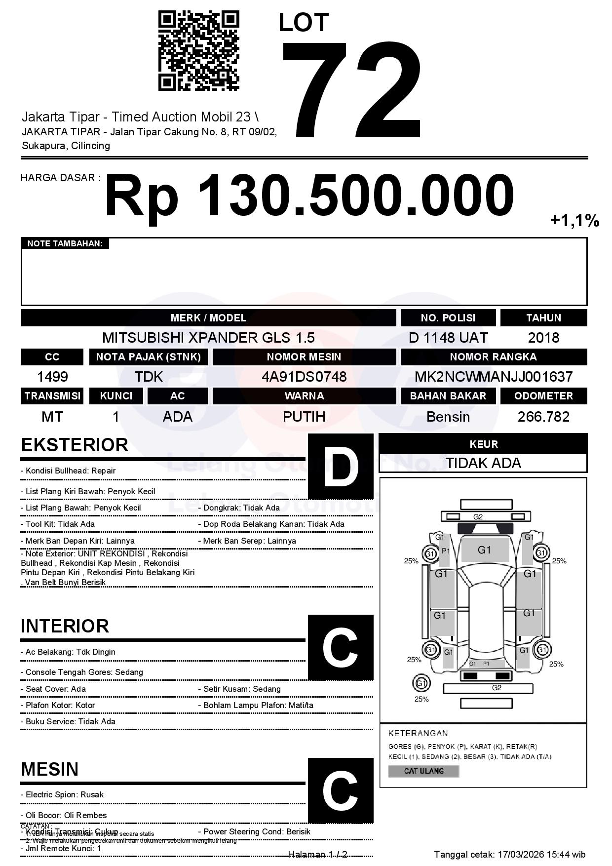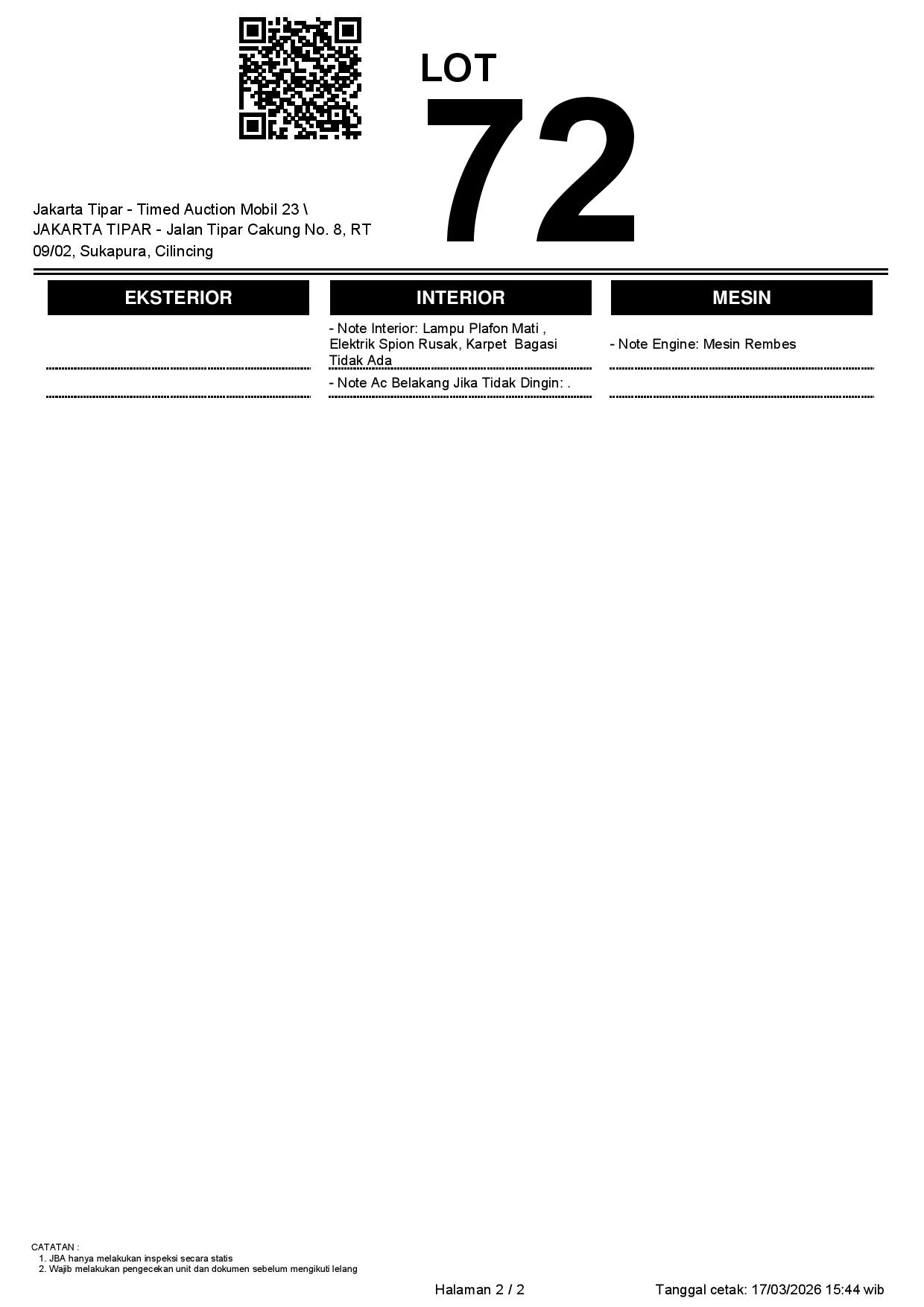 - Kondisi objek lelang dilelang apa adanya, baik kondisi fisik, mesin maupun legalitas kendaraan. Jika terdapat kekurangan/cacat baik yang terlihat maupun yang tidak terlihat, maka semua akan menjadi tanggung jawab/risiko Pemenang Lelang. Oleh karena itu, Pemenang Lelang melepaskan segala hak untuk menuntut dan/atau meminta ganti rugi atas hal tersebut kepada JBA.