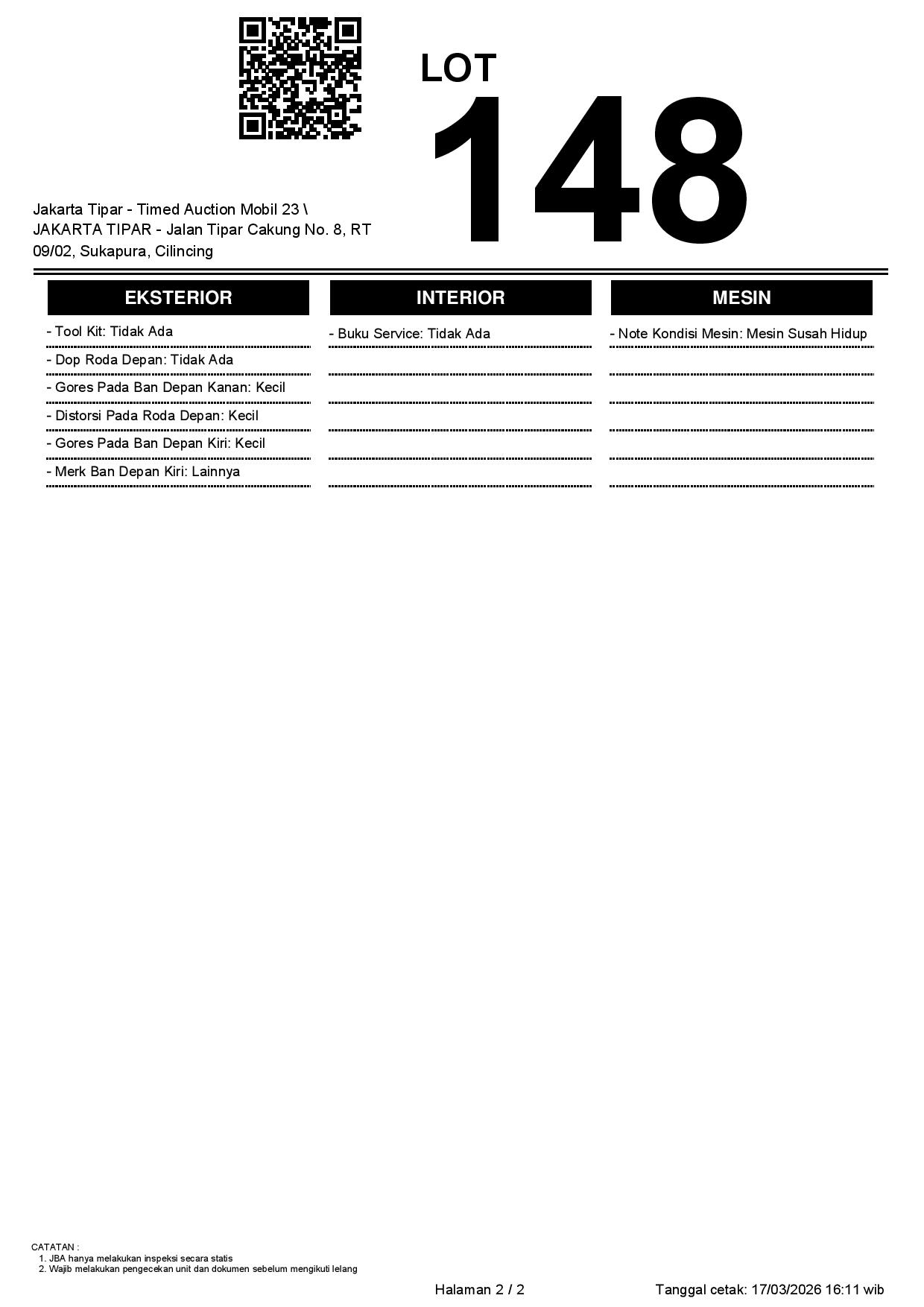 - Kondisi objek lelang dilelang apa adanya, baik kondisi fisik, mesin maupun legalitas kendaraan. Jika terdapat kekurangan/cacat baik yang terlihat maupun yang tidak terlihat, maka semua akan menjadi tanggung jawab/risiko Pemenang Lelang. Oleh karena itu, Pemenang Lelang melepaskan segala hak untuk menuntut dan/atau meminta ganti rugi atas hal tersebut kepada JBA.