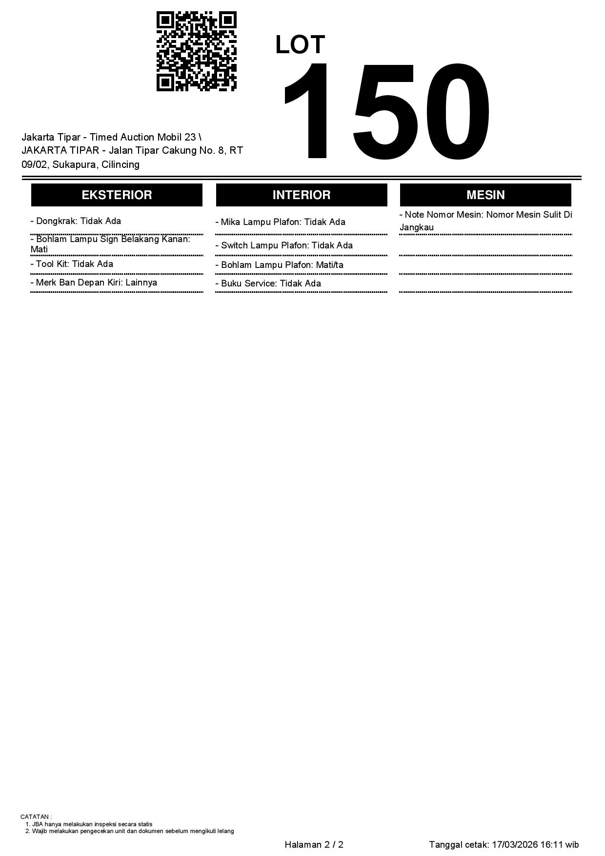 - Kondisi objek lelang dilelang apa adanya, baik kondisi fisik, mesin maupun legalitas kendaraan. Jika terdapat kekurangan/cacat baik yang terlihat maupun yang tidak terlihat, maka semua akan menjadi tanggung jawab/risiko Pemenang Lelang. Oleh karena itu, Pemenang Lelang melepaskan segala hak untuk menuntut dan/atau meminta ganti rugi atas hal tersebut kepada JBA.