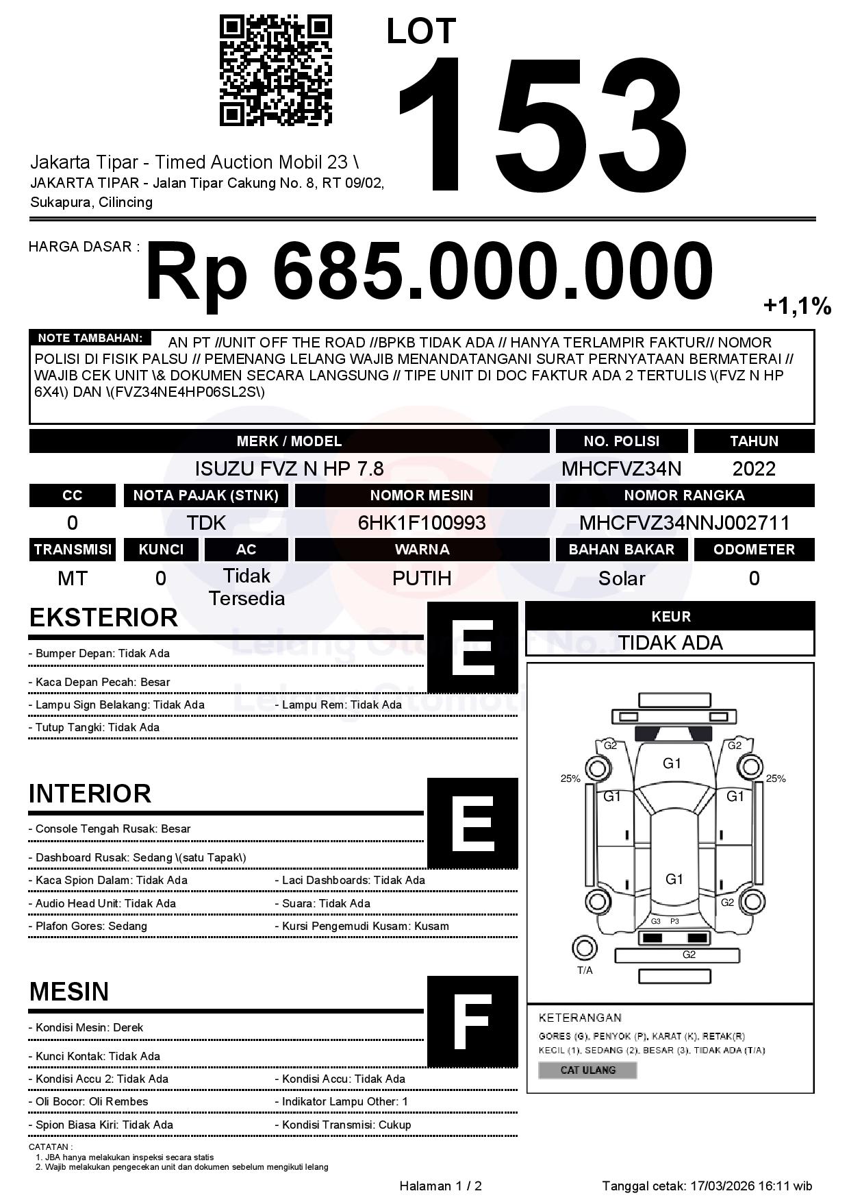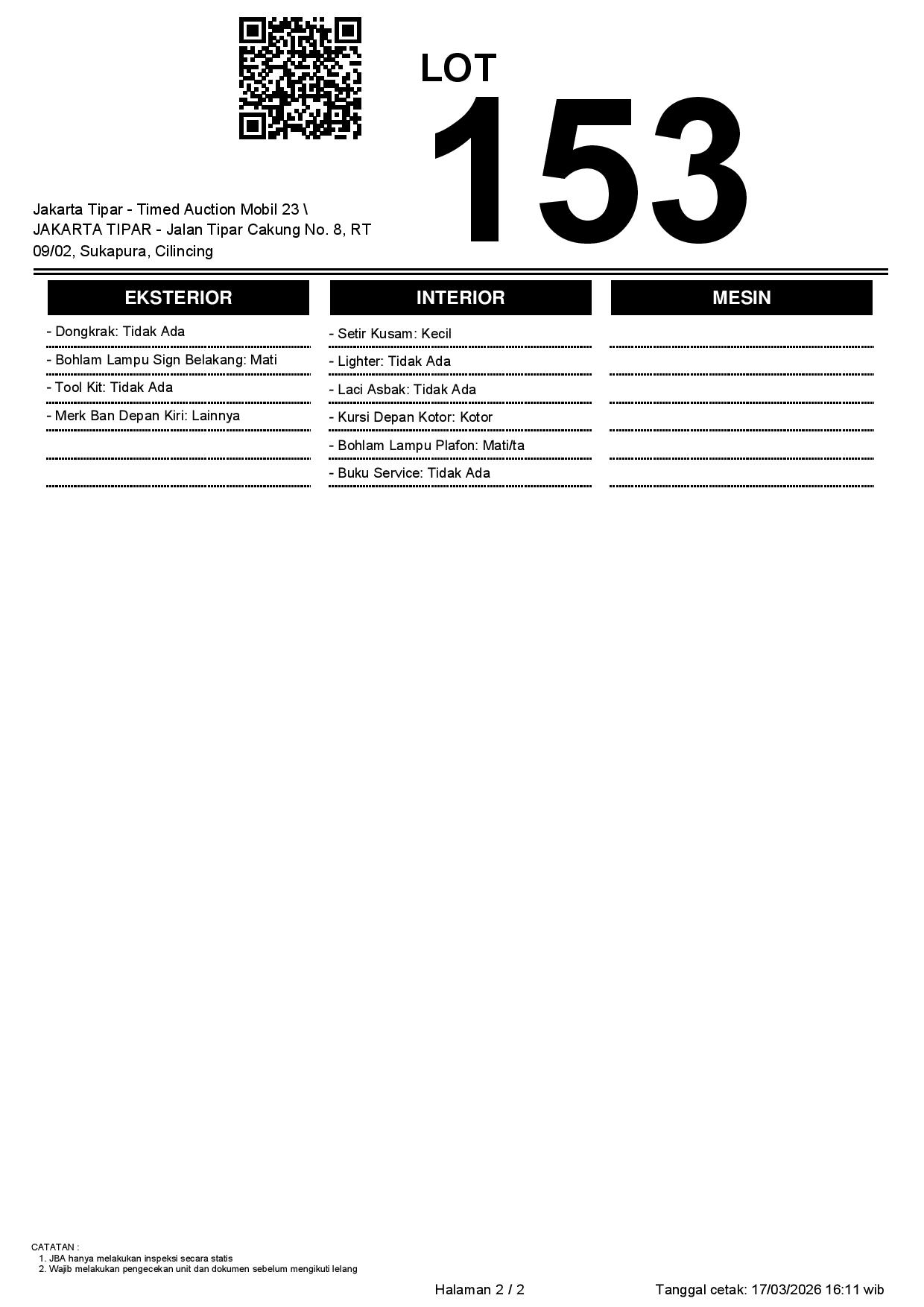- Kondisi objek lelang dilelang apa adanya, baik kondisi fisik, mesin maupun legalitas kendaraan. Jika terdapat kekurangan/cacat baik yang terlihat maupun yang tidak terlihat, maka semua akan menjadi tanggung jawab/risiko Pemenang Lelang. Oleh karena itu, Pemenang Lelang melepaskan segala hak untuk menuntut dan/atau meminta ganti rugi atas hal tersebut kepada JBA.