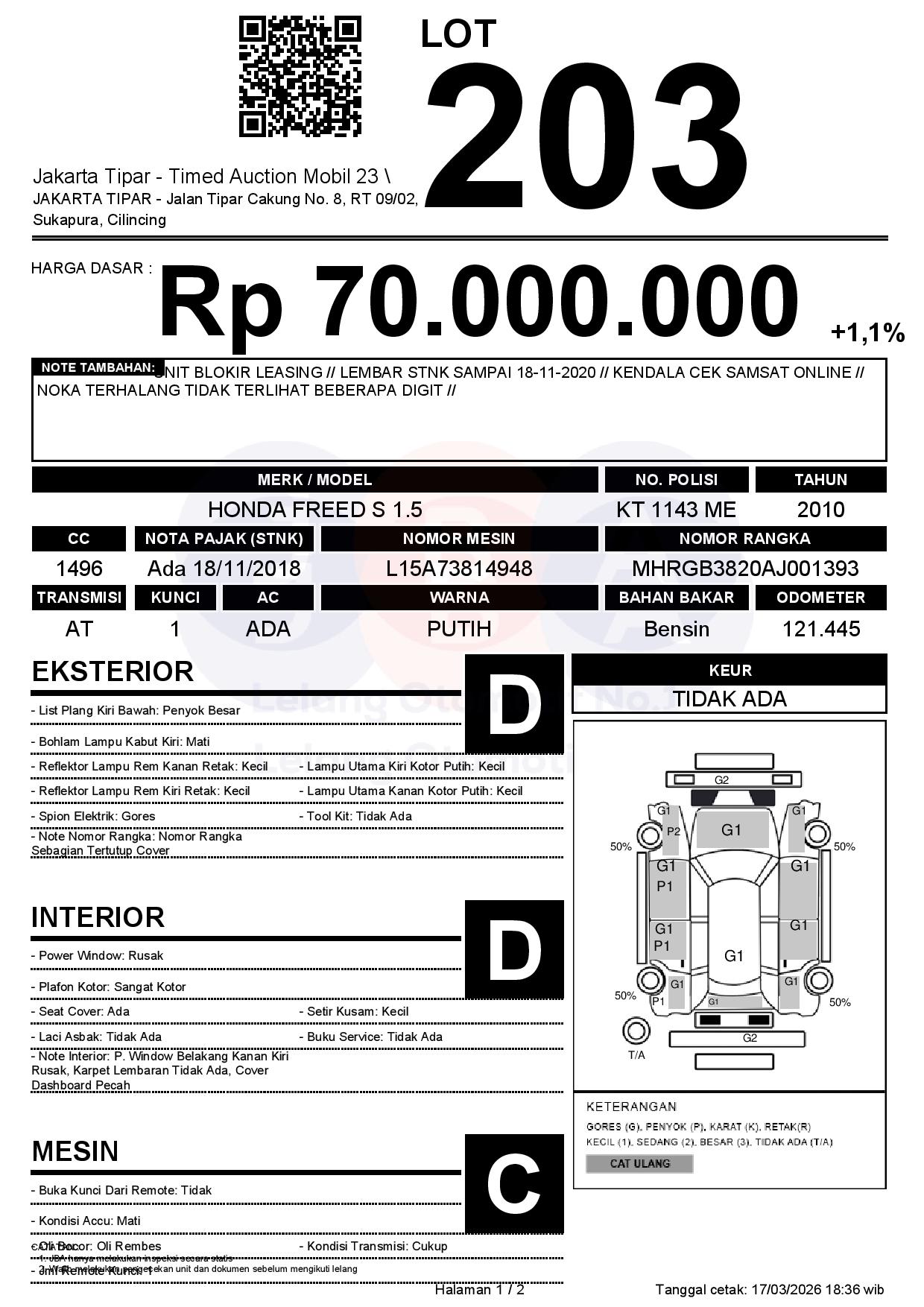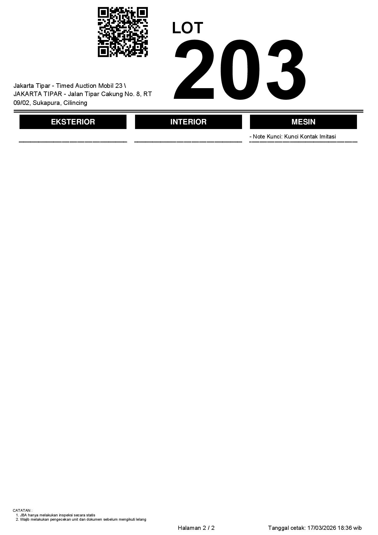 - Kondisi objek lelang dilelang apa adanya, baik kondisi fisik, mesin maupun legalitas kendaraan. Jika terdapat kekurangan/cacat baik yang terlihat maupun yang tidak terlihat, maka semua akan menjadi tanggung jawab/risiko Pemenang Lelang. Oleh karena itu, Pemenang Lelang melepaskan segala hak untuk menuntut dan/atau meminta ganti rugi atas hal tersebut kepada JBA.