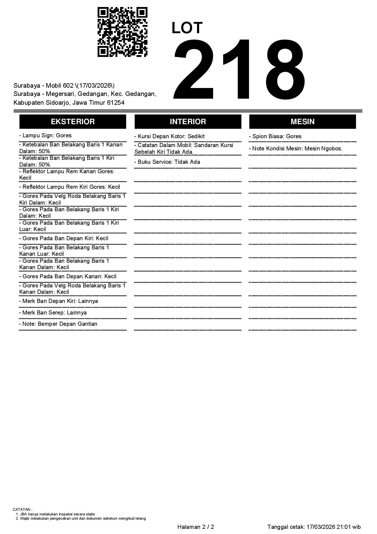 - Kondisi objek lelang dilelang apa adanya, baik kondisi fisik, mesin maupun legalitas kendaraan. Jika terdapat kekurangan/cacat baik yang terlihat maupun yang tidak terlihat, maka semua akan menjadi tanggung jawab/risiko Pemenang Lelang. Oleh karena itu, Pemenang Lelang melepaskan segala hak untuk menuntut dan/atau meminta ganti rugi atas hal tersebut kepada JBA.