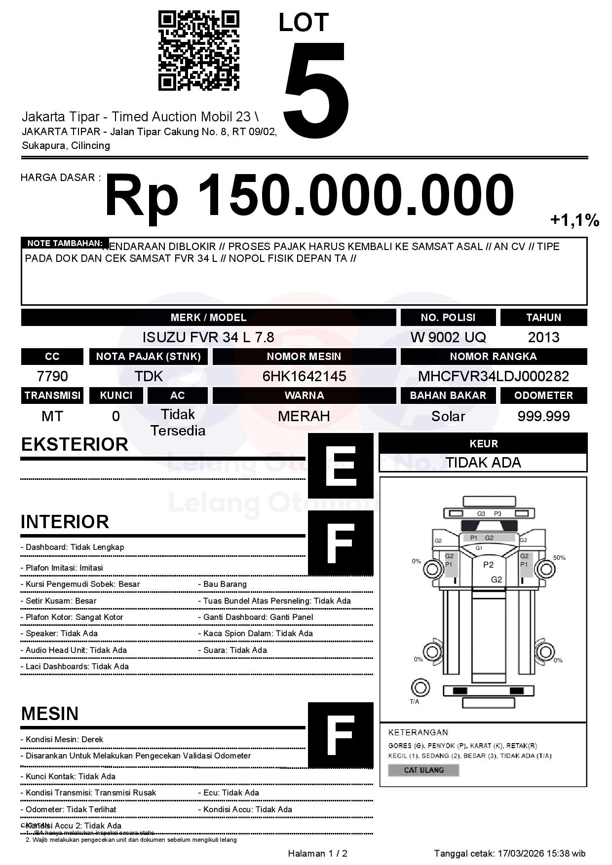 - Kondisi objek lelang dilelang apa adanya, baik kondisi fisik, mesin maupun legalitas kendaraan. Jika terdapat kekurangan/cacat baik yang terlihat maupun yang tidak terlihat, maka semua akan menjadi tanggung jawab/risiko Pemenang Lelang. Oleh karena itu, Pemenang Lelang melepaskan segala hak untuk menuntut dan/atau meminta ganti rugi atas hal tersebut kepada JBA.