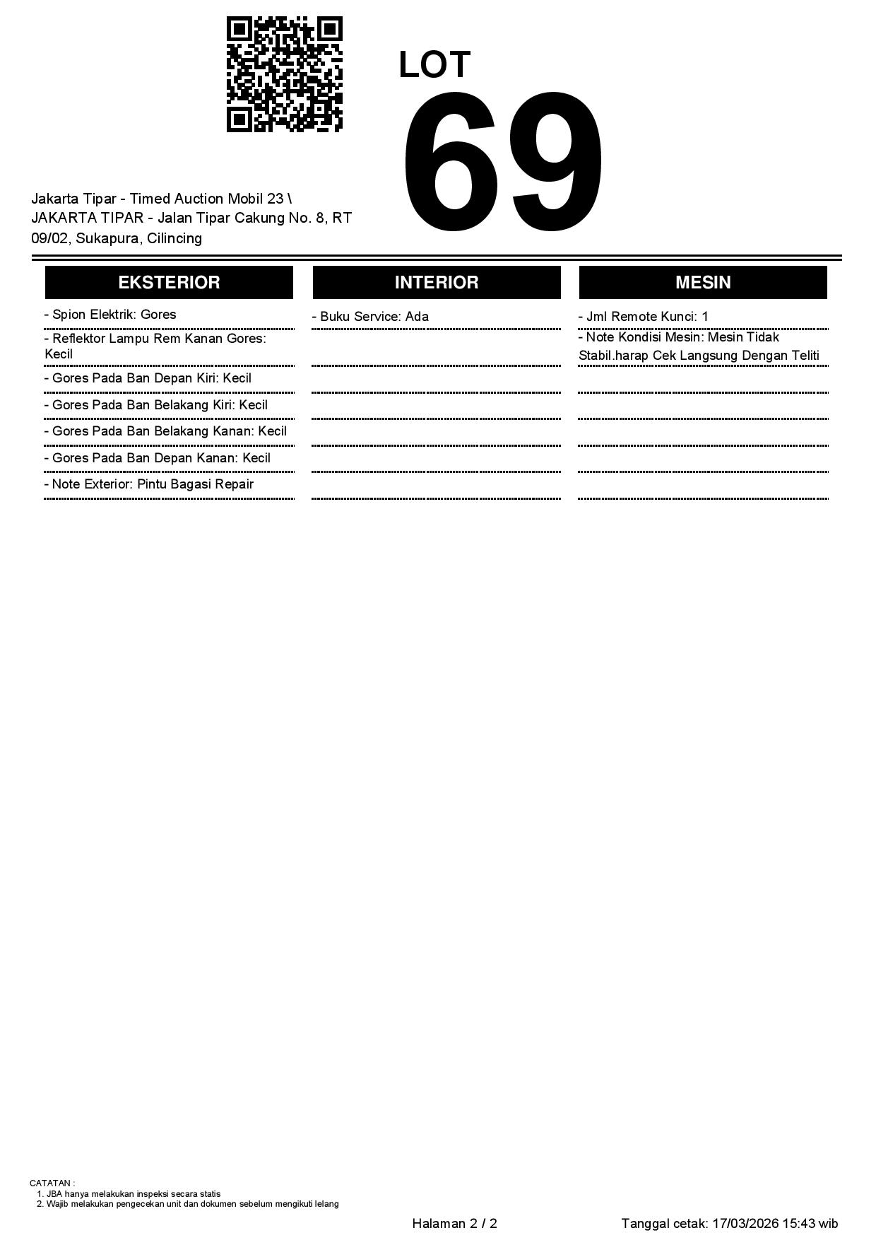 - Kondisi objek lelang dilelang apa adanya, baik kondisi fisik, mesin maupun legalitas kendaraan. Jika terdapat kekurangan/cacat baik yang terlihat maupun yang tidak terlihat, maka semua akan menjadi tanggung jawab/risiko Pemenang Lelang. Oleh karena itu, Pemenang Lelang melepaskan segala hak untuk menuntut dan/atau meminta ganti rugi atas hal tersebut kepada JBA.