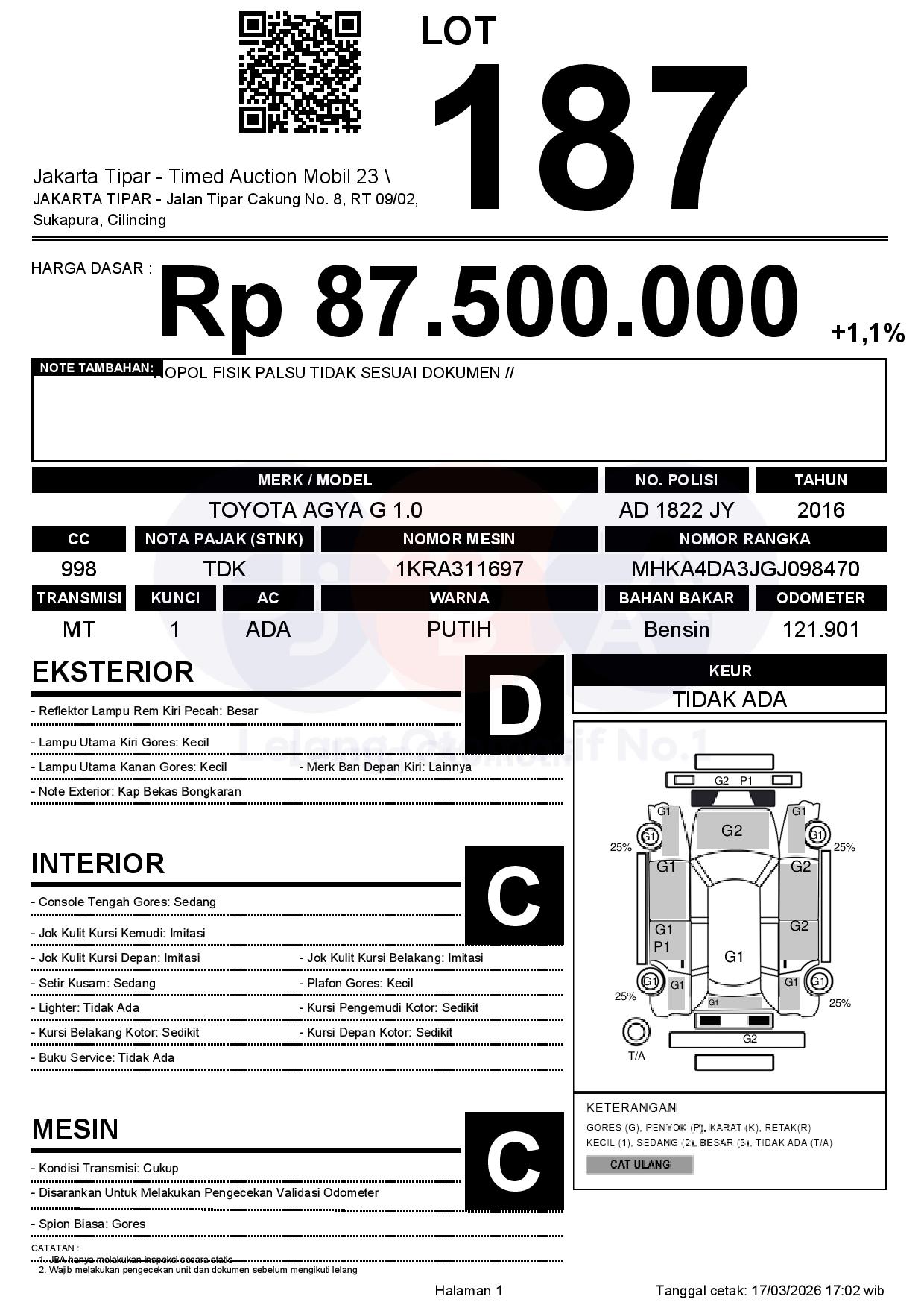 - Kondisi objek lelang dilelang apa adanya, baik kondisi fisik, mesin maupun legalitas kendaraan. Jika terdapat kekurangan/cacat baik yang terlihat maupun yang tidak terlihat, maka semua akan menjadi tanggung jawab/risiko Pemenang Lelang. Oleh karena itu, Pemenang Lelang melepaskan segala hak untuk menuntut dan/atau meminta ganti rugi atas hal tersebut kepada JBA.