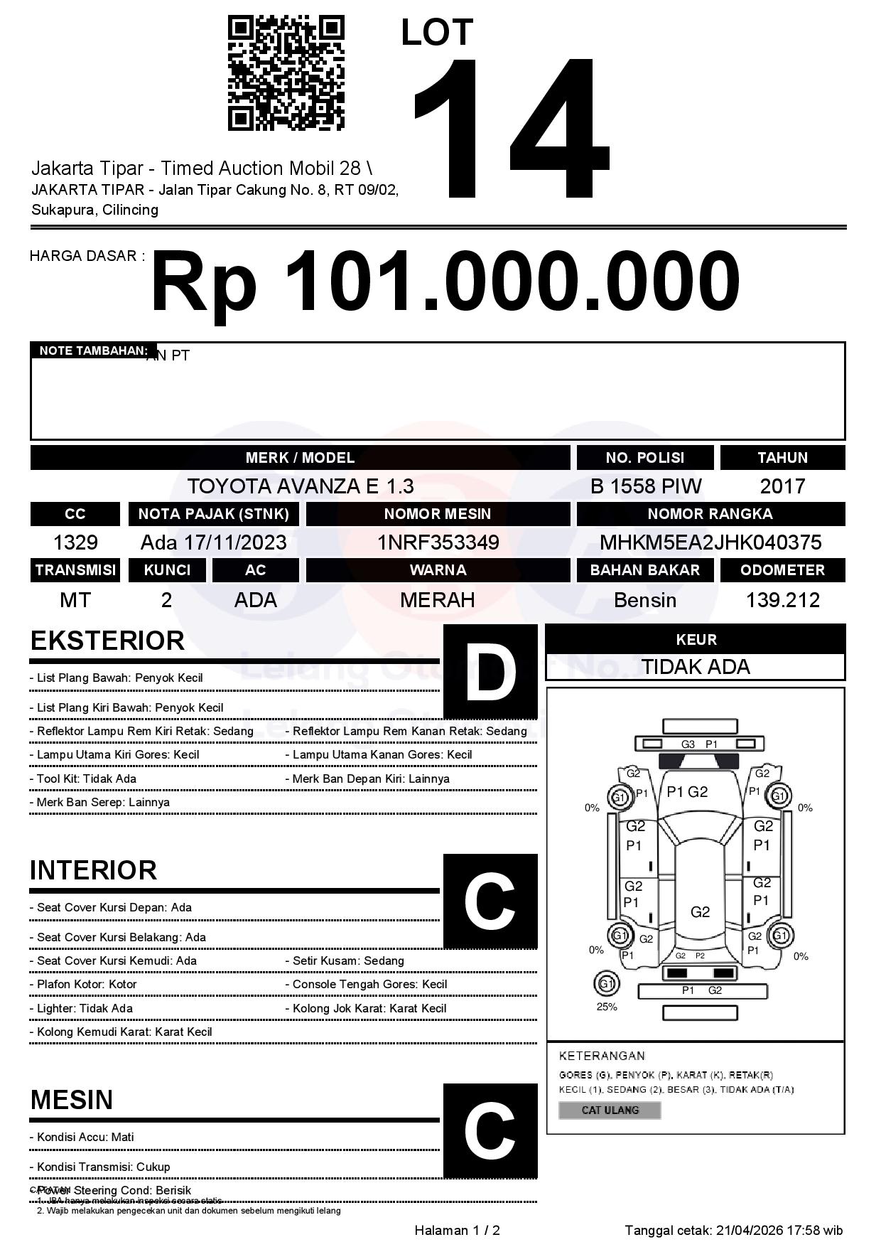 - Kondisi objek lelang dilelang apa adanya, baik kondisi fisik, mesin maupun legalitas kendaraan. Jika terdapat kekurangan/cacat baik yang terlihat maupun yang tidak terlihat, maka semua akan menjadi tanggung jawab/risiko Pemenang Lelang. Oleh karena itu, Pemenang Lelang melepaskan segala hak untuk menuntut dan/atau meminta ganti rugi atas hal tersebut kepada JBA.