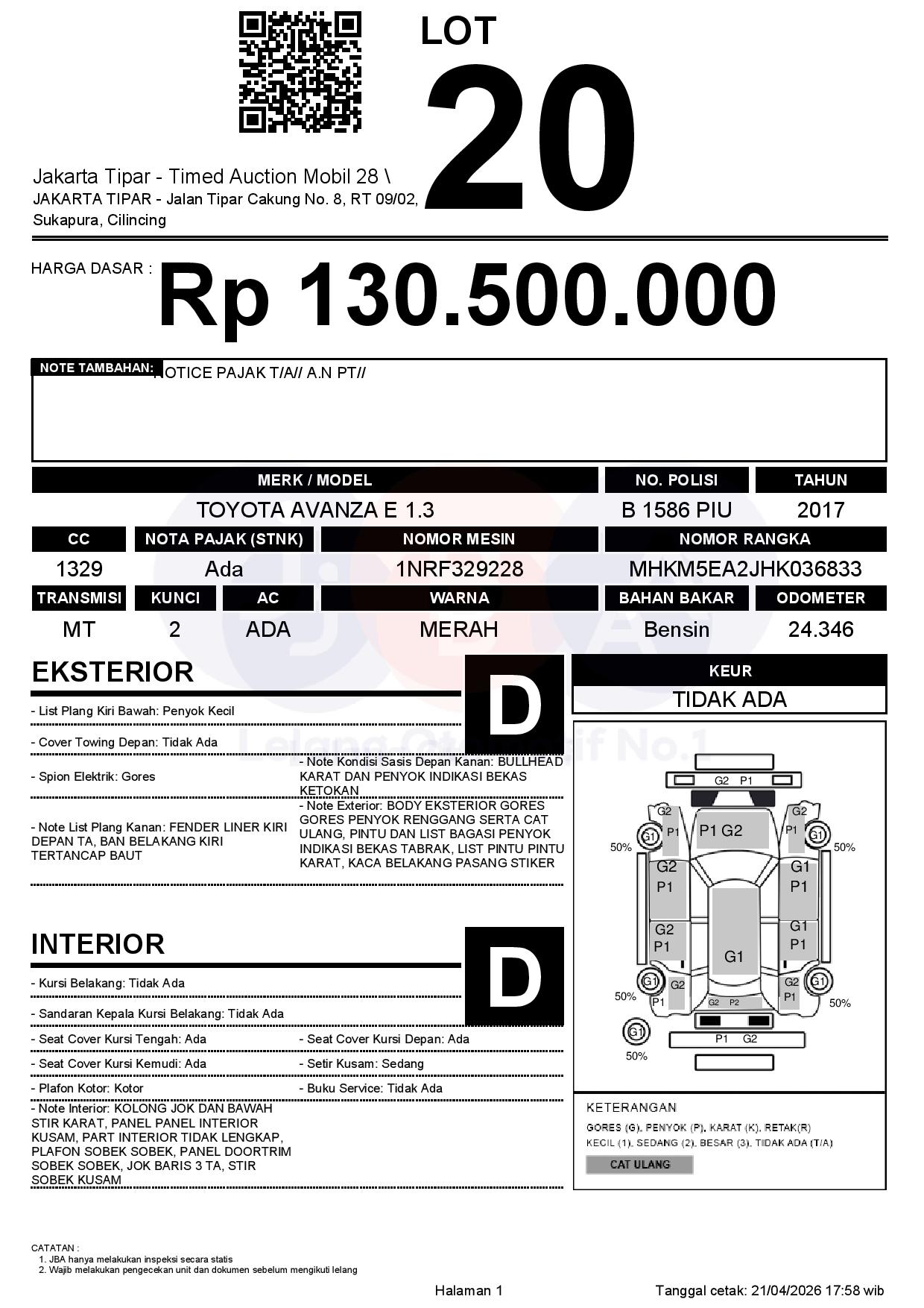- Kondisi objek lelang dilelang apa adanya, baik kondisi fisik, mesin maupun legalitas kendaraan. Jika terdapat kekurangan/cacat baik yang terlihat maupun yang tidak terlihat, maka semua akan menjadi tanggung jawab/risiko Pemenang Lelang. Oleh karena itu, Pemenang Lelang melepaskan segala hak untuk menuntut dan/atau meminta ganti rugi atas hal tersebut kepada JBA.